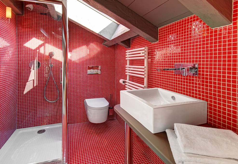 Double bedroom with queen-size bed, shower and Ensuite bathroom with sink, shower, wc