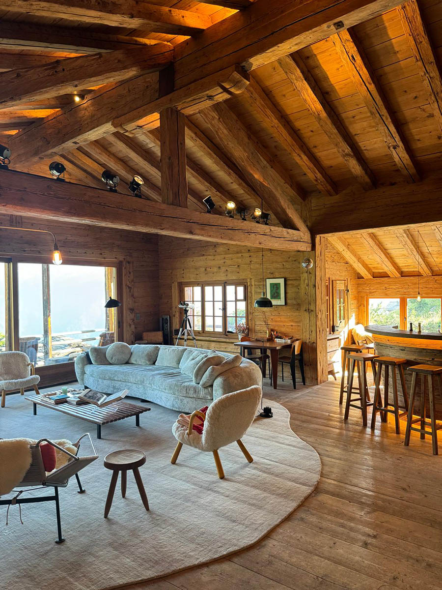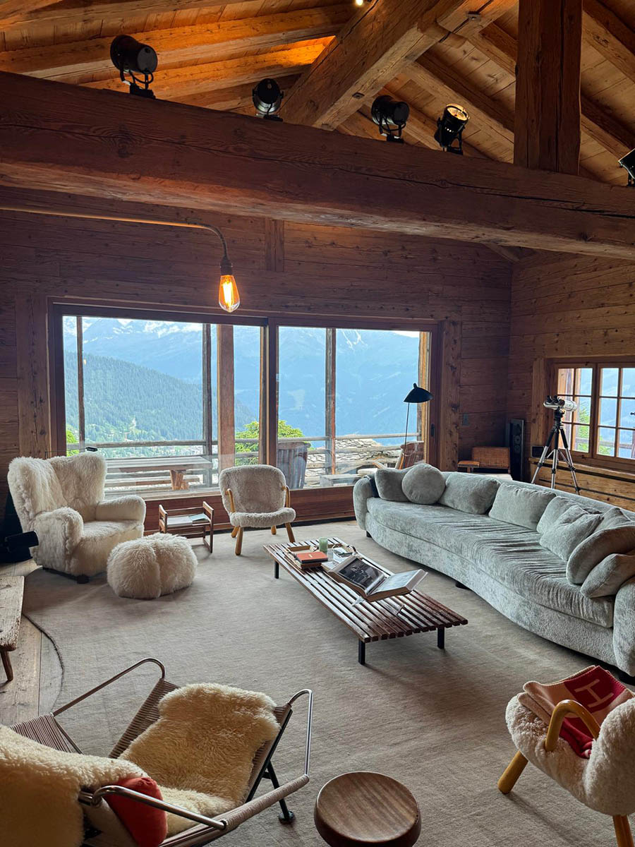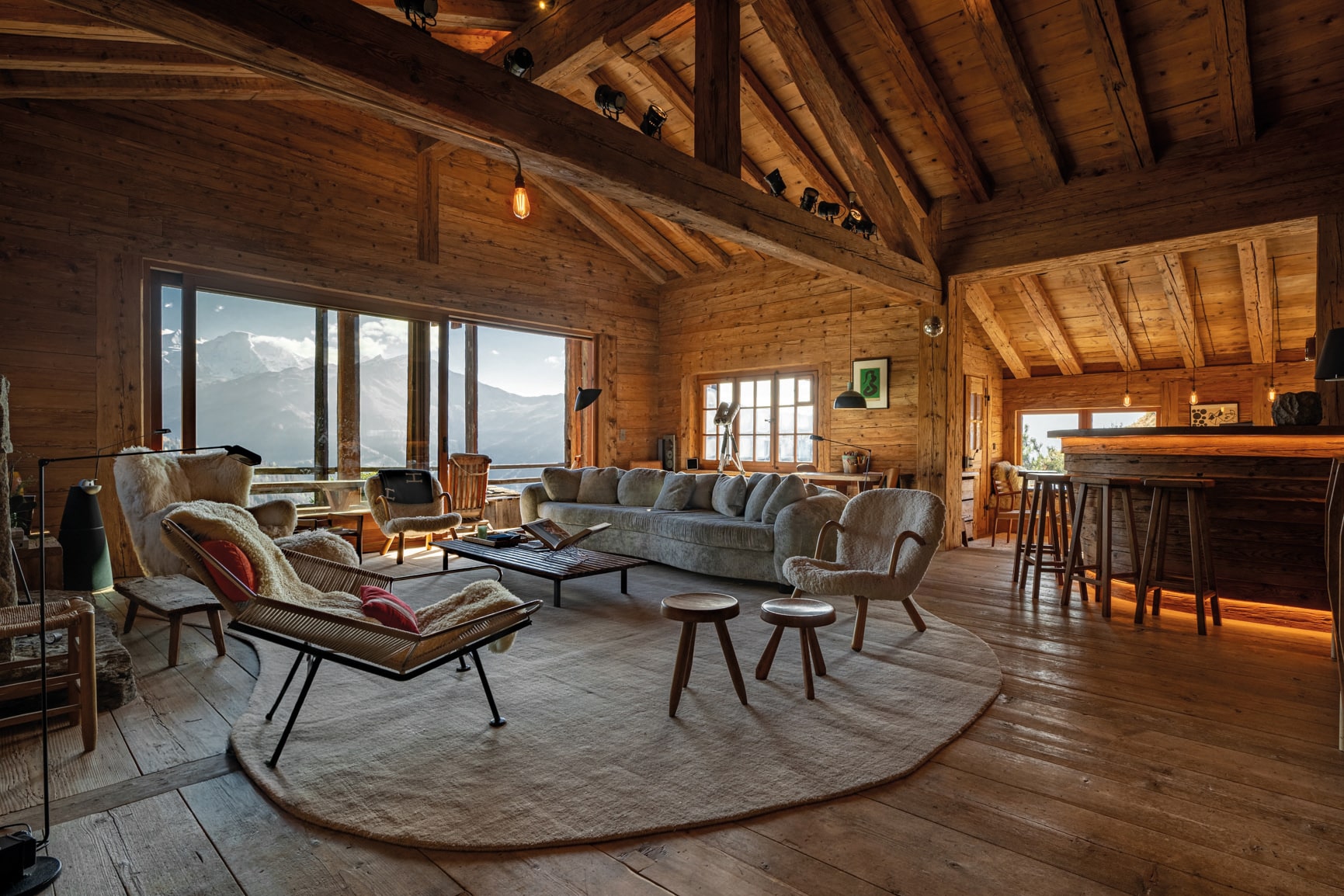 In Verbier, in the heart of the Swiss Alps, this 400 sqm chalet opens onto the surrounding mountains. Six bedrooms, six bathrooms, a design that blends Alpine tradition with contemporary art — including works by Alexander Calder, mobiles and sculptures, lending the spaces a singular character.