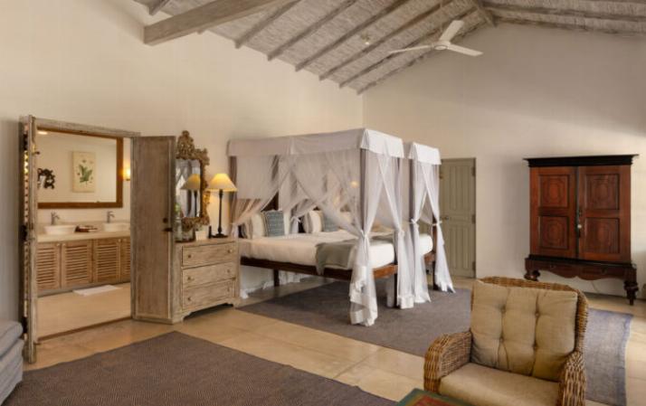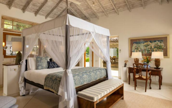 Double bedroom leading out to the pool and facing the sea with queen-size bed
