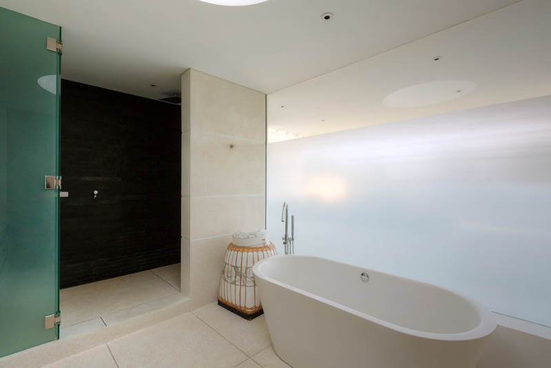 Double bedroom with safe, television, king-size bed and Ensuite bathroom with double sink, hair dryer, shower, bath