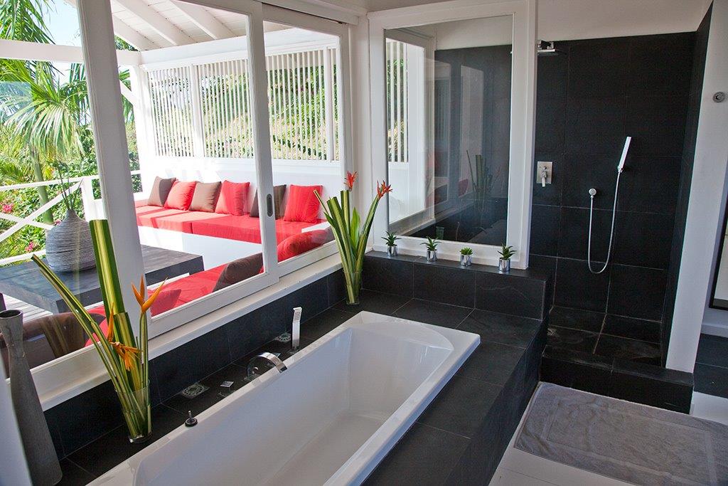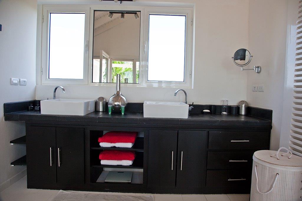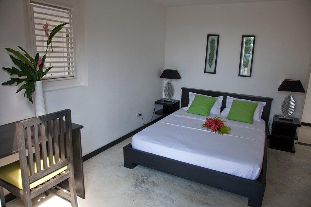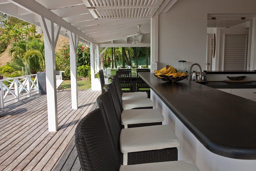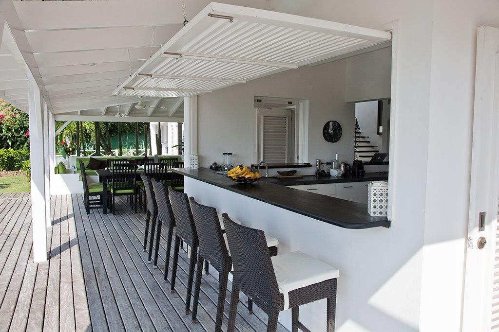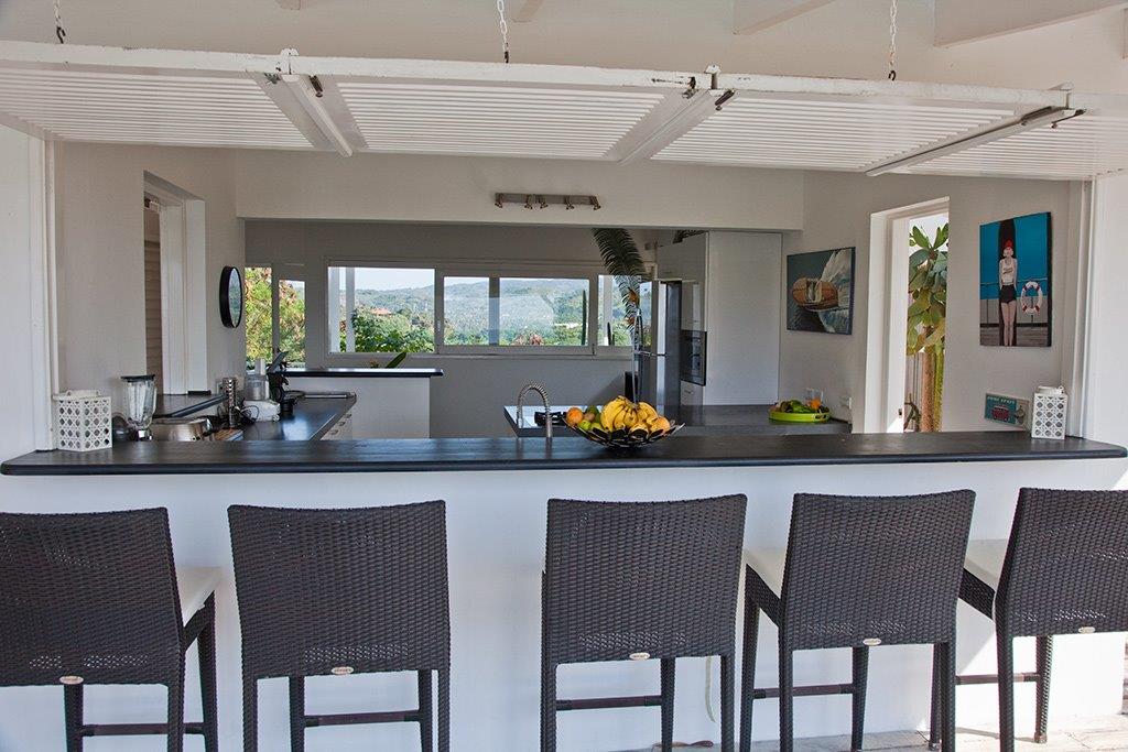 This nice house with its colonial style is situated in a secured residence 10 minutes from the beach of Las Ballenas. A little further, only 2 km away, is the village of Las Terrenas with all the commodities you may need during your holidays: restaurants, bars and others shops. Located on a small hill, the situation of the villa offers you a great view on the Ocean, Coson’s bay and Bonita. This sea view can be observed from many places because a lot of terraces are around the villa. It can be from the bedrooms or the infinity pool, you will always be able to look at the blue from the Ocean as well as the green plants that is stretches out at the feet of the house. The sweetness of life is here at its height. Comfortably furnished, the property has been built to welcome large group up to 14 people. The independent bungalow nestled in the tropical garden will be perfect for people who are looking for a little more intimacy. The American kitchen, with its bar overlooked on the terrace and its louvered shutters gives it a convivial touch like a beach hut.