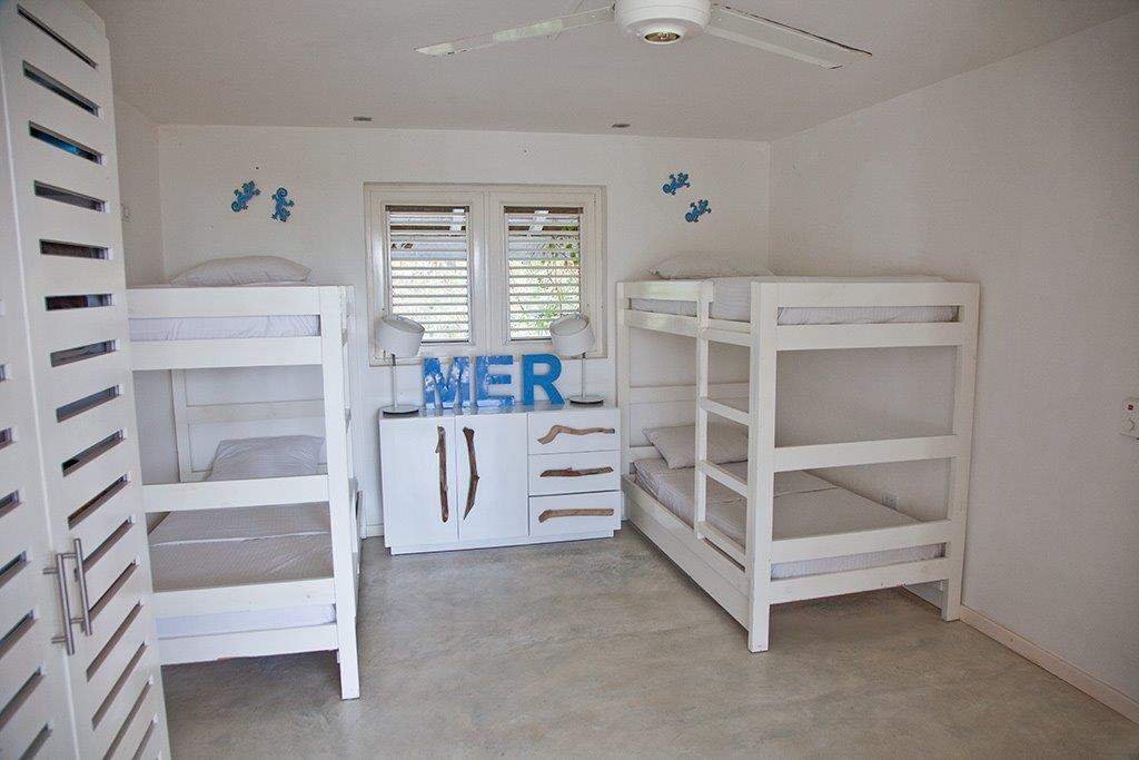 Dormitory bedroom with bunk beds for 4 children with living room area and Equipped Terrace with lounge area and Shared bathroom with double shower and separate WC