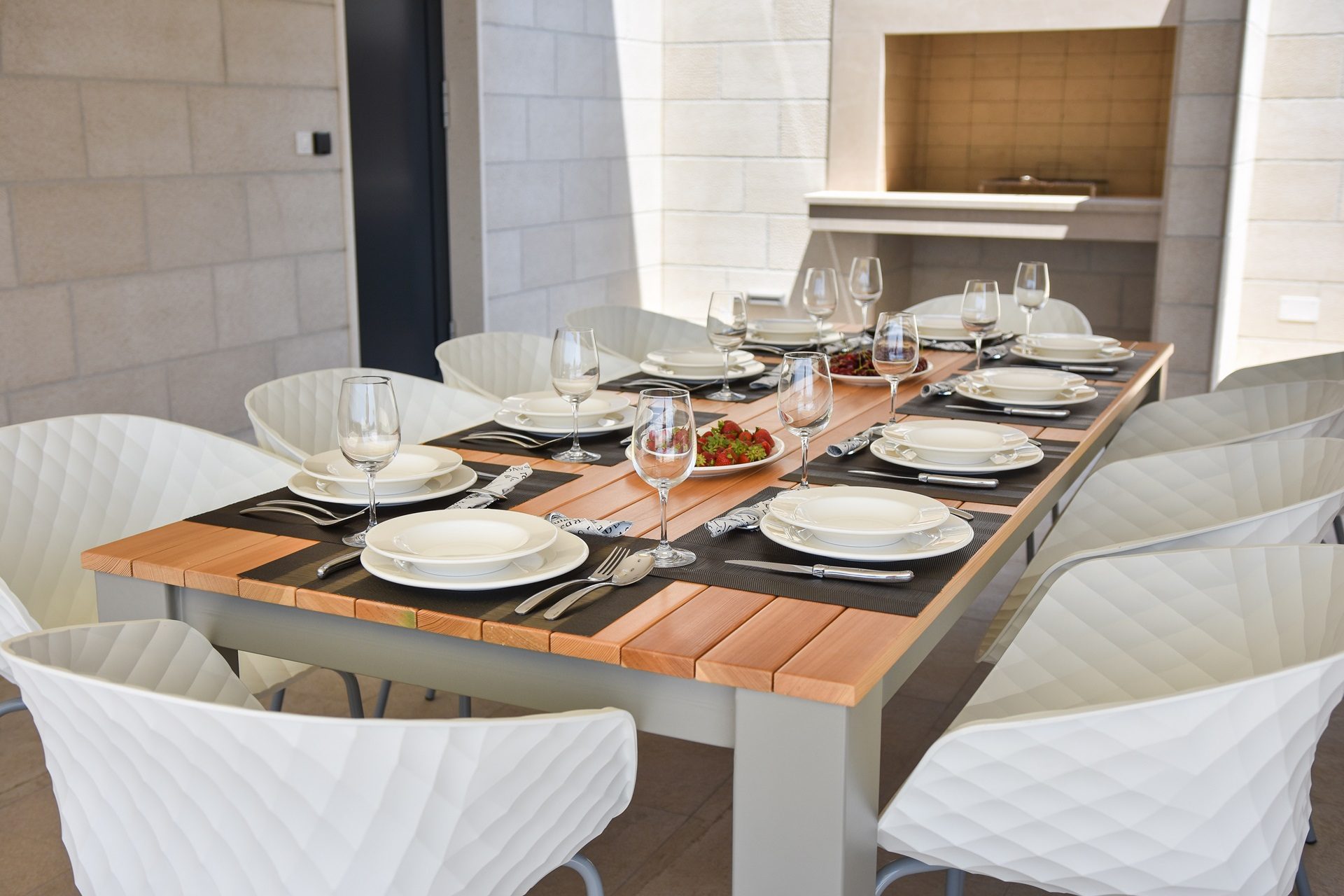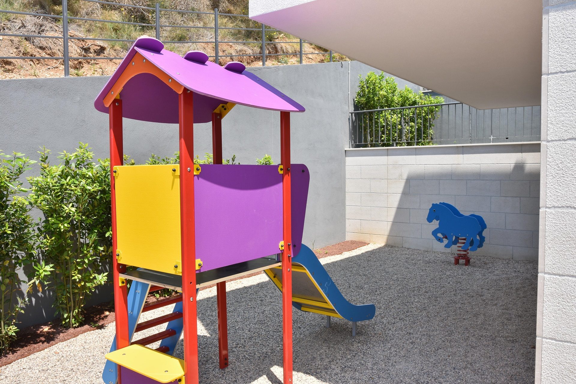 The villa has a fenced garden with sea views. The sitting room opens out onto the sunbathing terrace with 6 sun loungers and a parasol. There is a private swimming pool, size 30 m2 with an outdoor shower. The garden has a barbecue and a covered dining area with 10 dining chairs. In the second part of the garden is a children’s playground area.
