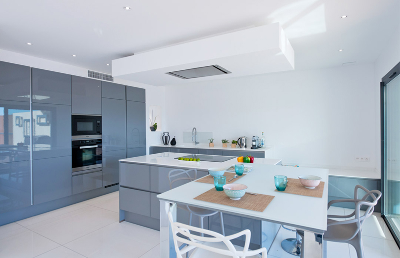 Open kitchen with electric oven, fridge, microwave oven, dishwasher, induction hob, kettle, expresso machine