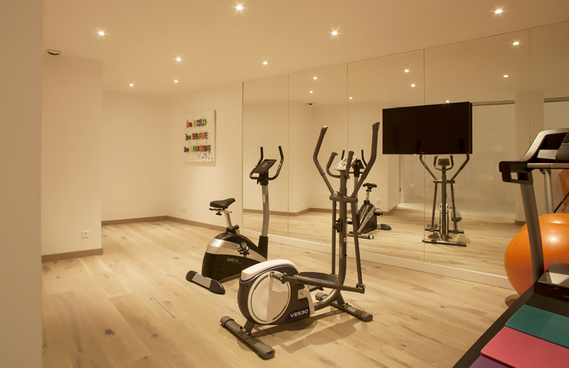 Gym Room with running machine, cross trainer, bicycle, Swiss ball, mirror wall, TV