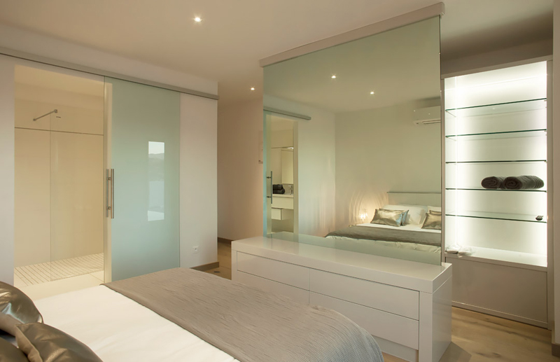 Double bedroom with queen-size bed, walk-in closet, terrace access, lcd tv, safe and Ensuite bathroom with wc, shower, sink