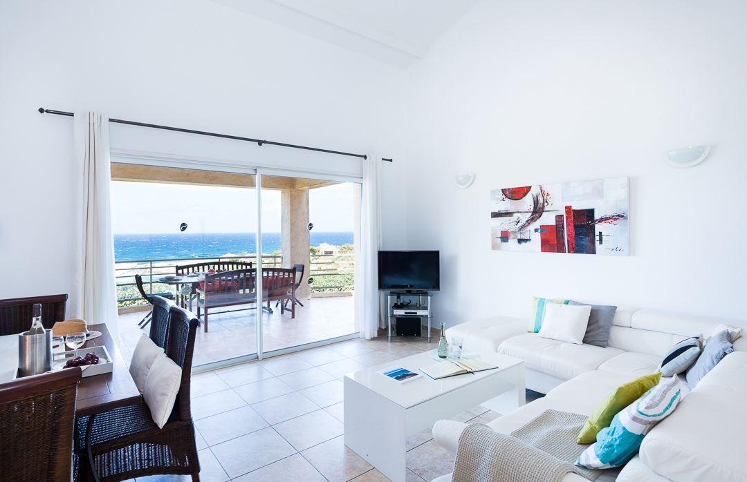 Living Room with dining area with television, dvd player, hifi system, sea view, terrace access