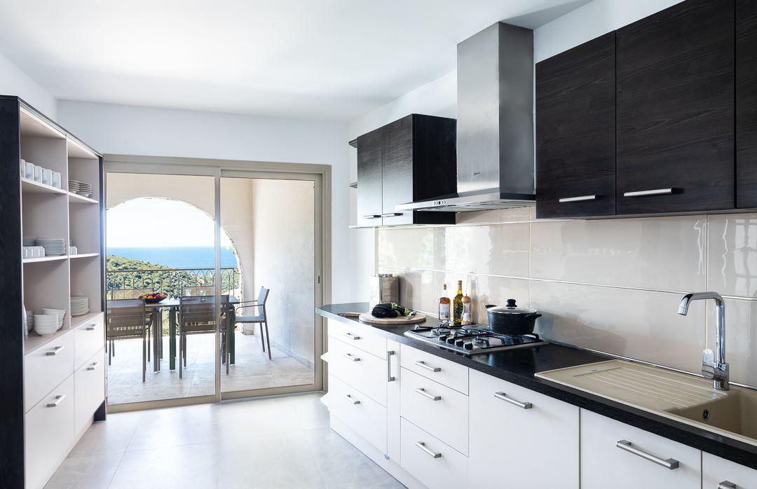 Kitchen with electric oven, microwave oven, nespresso machine, fridge, dishwasher, washing machine, gas stove, terrace access
