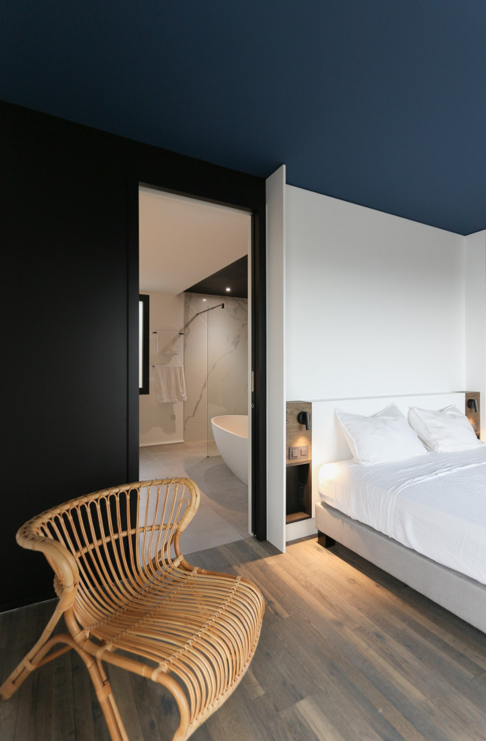 Double bedroom with king-size bed, sea view and Ensuite bathroom with sink, shower and Toilets