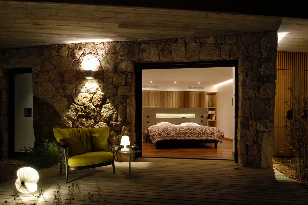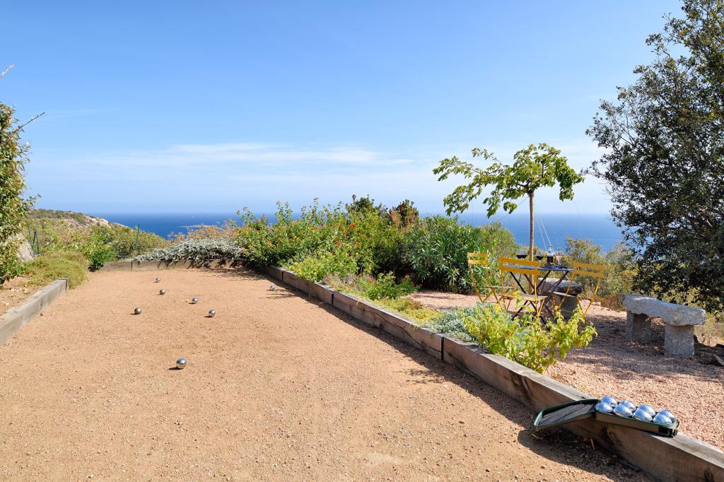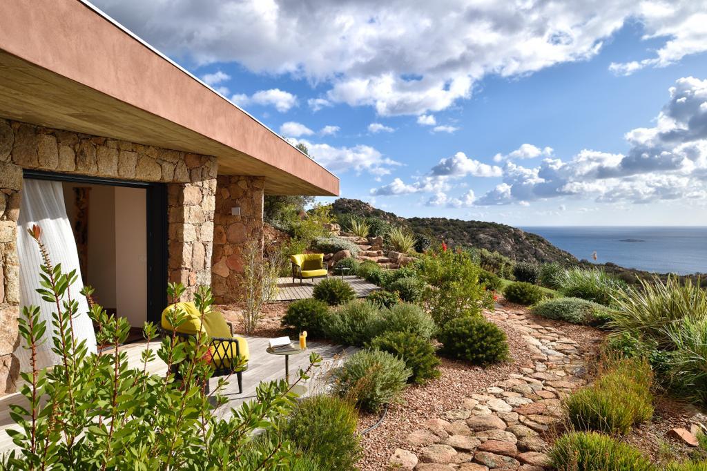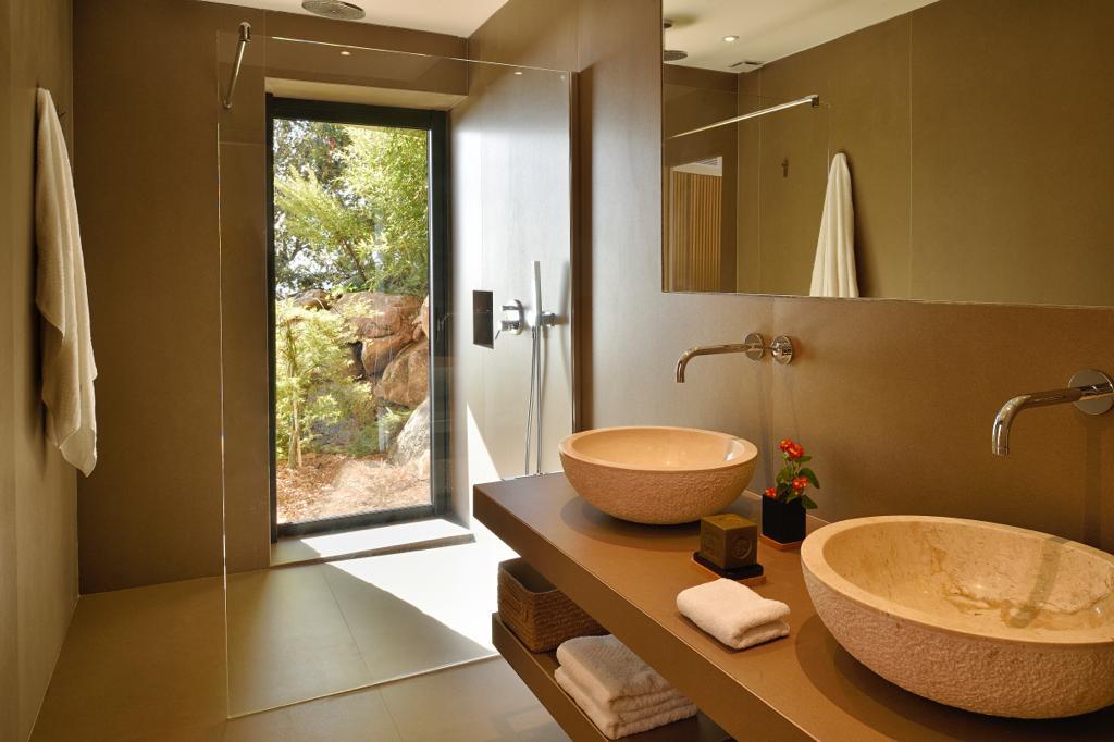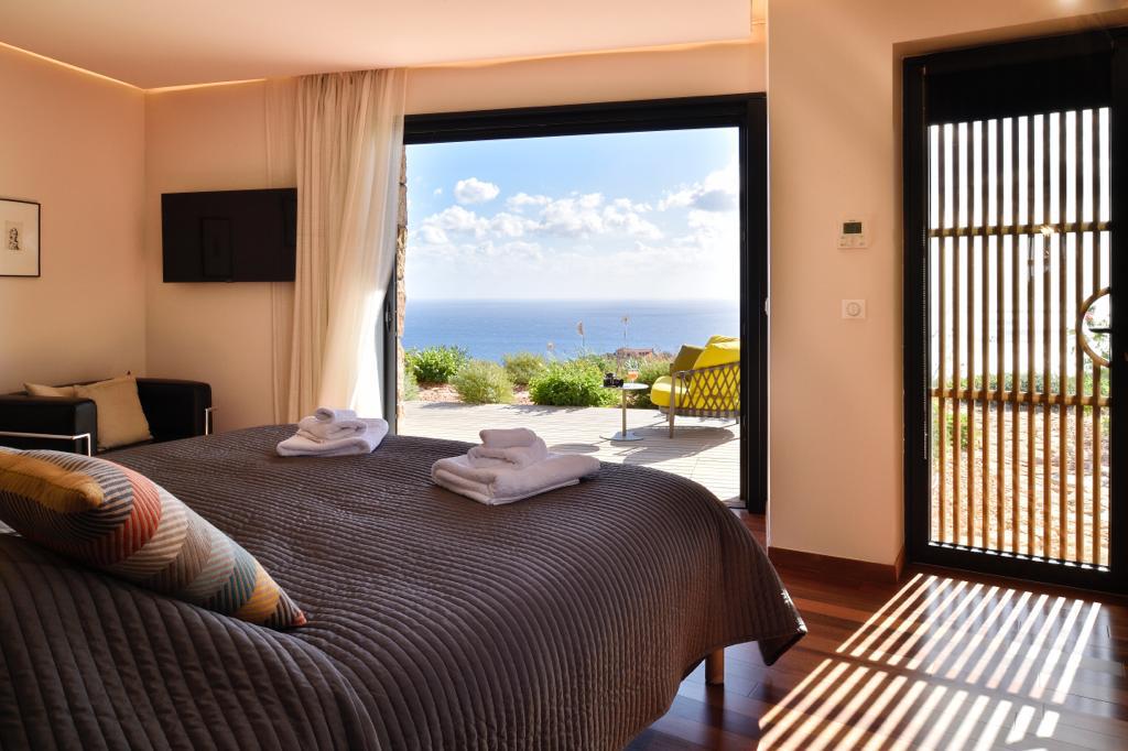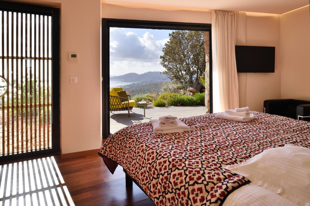 Visite Aurore Octobre 2019 - De la route qui relie les plages de Palombaggia à Santa Giulia, je prends de la hauteur par une route avec quelques virages qui me mène sur le flanc de la colline. Arrivée au portail de la propriété j’ai hâte de voir la vue qui se cache de l’autre côté… Du jardin la vue est absolument époustouflante : en premier plan la côte et les rochers qui descendent vers la mer, et à l’horizon que du bleu à perte de vue. La villa est magnifique, de grandes terrasses couvertes longent la maison, toutes orientées vers la mer bien évidemment. La décoration intérieure est moderne et accueillante, de beaux volumes avec toujours de grandes baies vitrées pour profiter au maximum du spectacle. La chambre de maître dispose d’une baie vitrée en angle avec sa propre terrasse privée, trois autres donnent sur une terrasse toujours vue mer, et la quatrième dispose d’une terrasse qui donne sur un petit jardin privatif. Du patio je monte le petit escalier de fer forgé en colimaçon (donc pas adapté à tout le monde) qui donne accès à la suite à l’étage, complètement indépendante. La décoration est moderne et un peu ethnique avec des notes orientales. J’arrive sur la terrasse qui me donne l’impression d’être tel un aigle perché dans son nid sur un sommet qui domine la mer. Un nid grand et douillet avec tout le confort et un hammam en plus. Cette chambre est idéale pour un jeune couple qui souhaite garder son indépendance. Les deux autres chambres sont situées à l’écart du bâtiment principal dans une annexe, en contre bas du jardin. On y accède par un chemin qui comporte des marches et des dénivelés, je ne les conseille donc pas aux personnes ayant des problèmes de mobilité ou aux parents avec de jeunes enfants. Elles seront parfaites pour des couples ou des jeunes qui pourront profiter en toute indépendance d’une superbe vue mer.Villa - Porto Vecchio