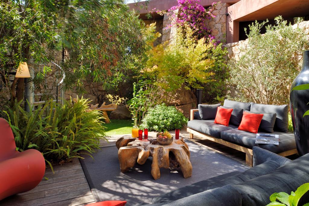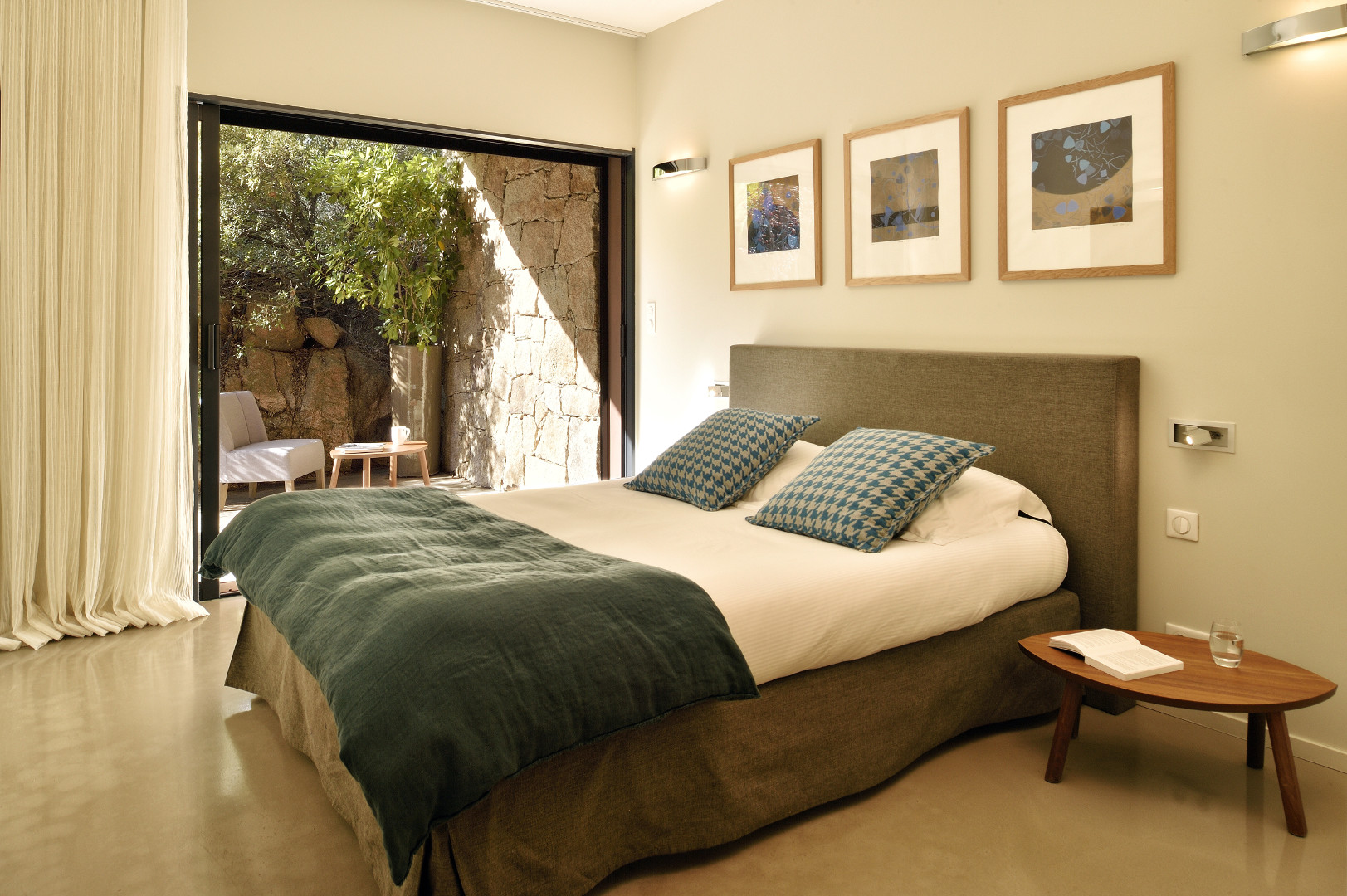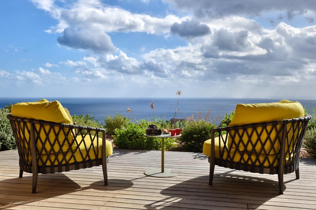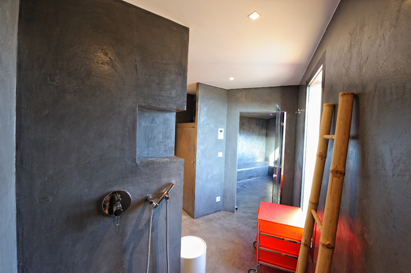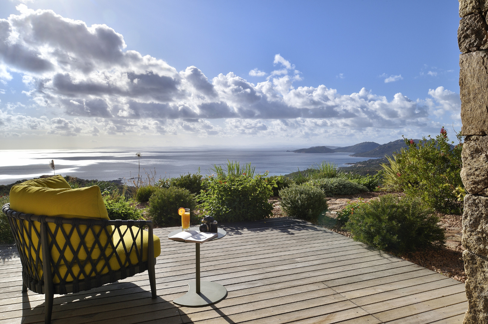 Visite Aurore Octobre 2019 - De la route qui relie les plages de Palombaggia à Santa Giulia, je prends de la hauteur par une route avec quelques virages qui me mène sur le flanc de la colline. Arrivée au portail de la propriété j’ai hâte de voir la vue qui se cache de l’autre côté… Du jardin la vue est absolument époustouflante : en premier plan la côte et les rochers qui descendent vers la mer, et à l’horizon que du bleu à perte de vue. La villa est magnifique, de grandes terrasses couvertes longent la maison, toutes orientées vers la mer bien évidemment. La décoration intérieure est moderne et accueillante, de beaux volumes avec toujours de grandes baies vitrées pour profiter au maximum du spectacle. La chambre de maître dispose d’une baie vitrée en angle avec sa propre terrasse privée, trois autres donnent sur une terrasse toujours vue mer, et la quatrième dispose d’une terrasse qui donne sur un petit jardin privatif. Du patio je monte le petit escalier de fer forgé en colimaçon (donc pas adapté à tout le monde) qui donne accès à la suite à l’étage, complètement indépendante. La décoration est moderne et un peu ethnique avec des notes orientales. J’arrive sur la terrasse qui me donne l’impression d’être tel un aigle perché dans son nid sur un sommet qui domine la mer. Un nid grand et douillet avec tout le confort et un hammam en plus. Cette chambre est idéale pour un jeune couple qui souhaite garder son indépendance. Les deux autres chambres sont situées à l’écart du bâtiment principal dans une annexe, en contre bas du jardin. On y accède par un chemin qui comporte des marches et des dénivelés, je ne les conseille donc pas aux personnes ayant des problèmes de mobilité ou aux parents avec de jeunes enfants. Elles seront parfaites pour des couples ou des jeunes qui pourront profiter en toute indépendance d’une superbe vue mer.Villa - Porto Vecchio