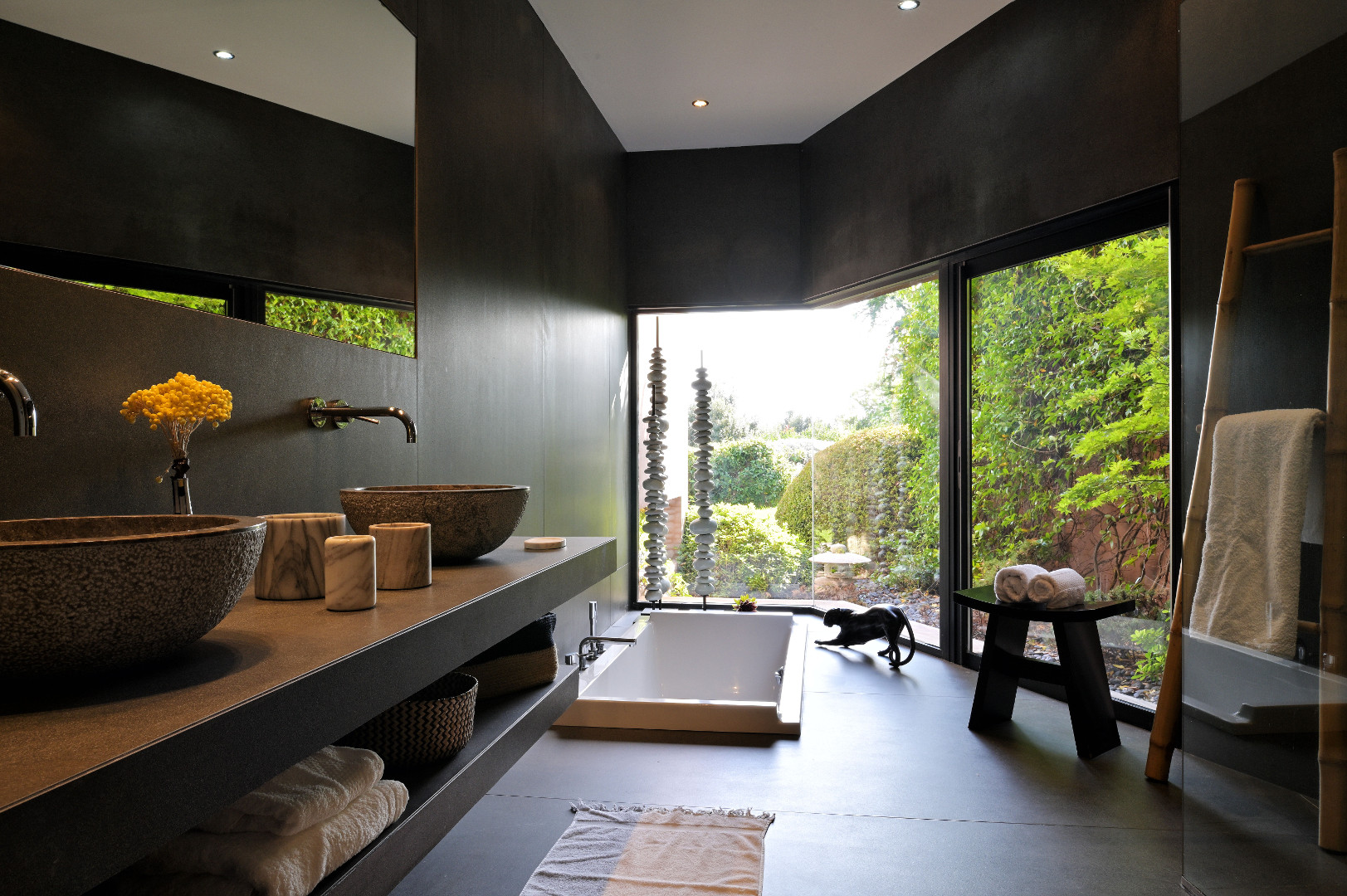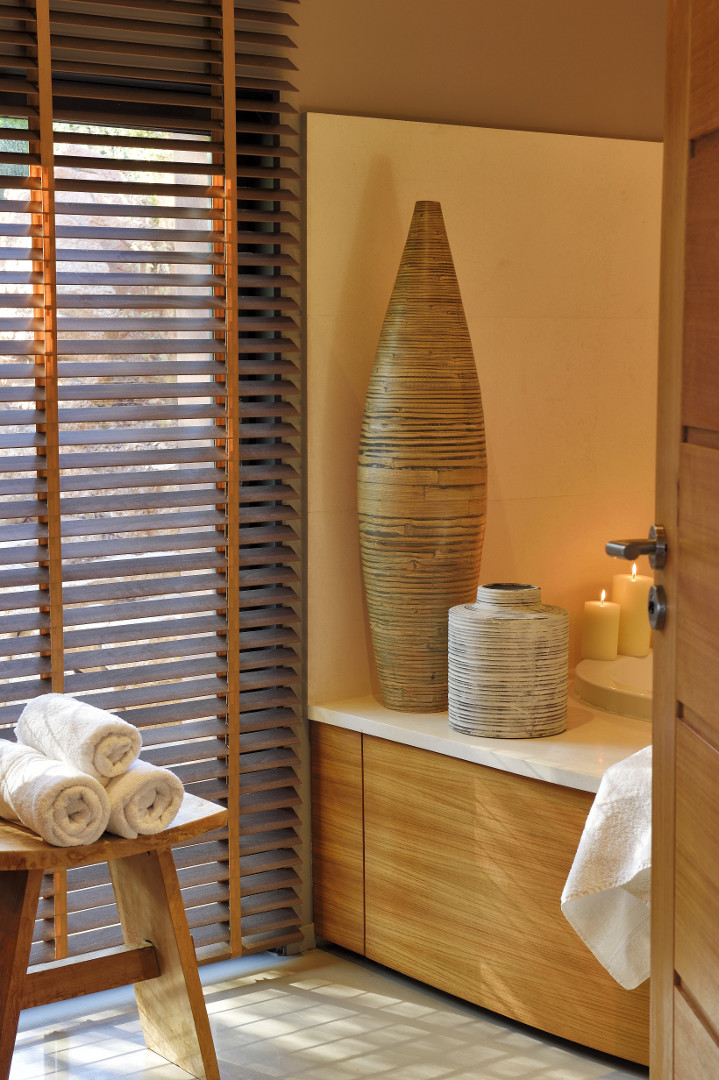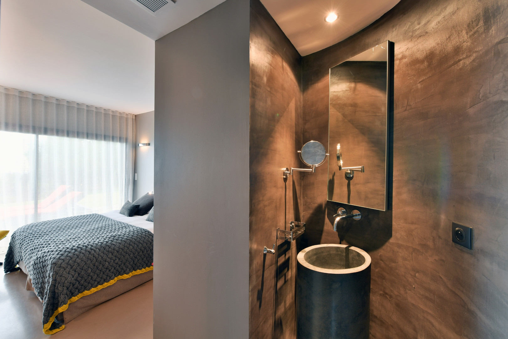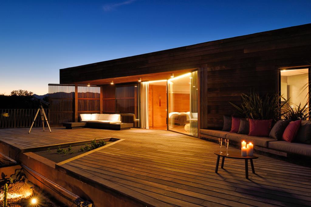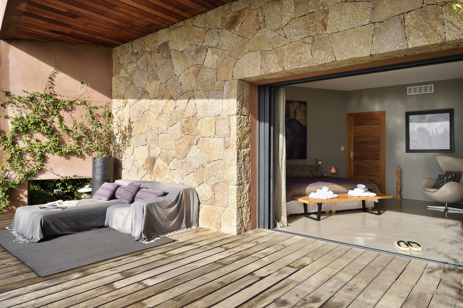 Visite Aurore Octobre 2019 - De la route qui relie les plages de Palombaggia à Santa Giulia, je prends de la hauteur par une route avec quelques virages qui me mène sur le flanc de la colline. Arrivée au portail de la propriété j’ai hâte de voir la vue qui se cache de l’autre côté… Du jardin la vue est absolument époustouflante : en premier plan la côte et les rochers qui descendent vers la mer, et à l’horizon que du bleu à perte de vue. La villa est magnifique, de grandes terrasses couvertes longent la maison, toutes orientées vers la mer bien évidemment. La décoration intérieure est moderne et accueillante, de beaux volumes avec toujours de grandes baies vitrées pour profiter au maximum du spectacle. La chambre de maître dispose d’une baie vitrée en angle avec sa propre terrasse privée, trois autres donnent sur une terrasse toujours vue mer, et la quatrième dispose d’une terrasse qui donne sur un petit jardin privatif. Du patio je monte le petit escalier de fer forgé en colimaçon (donc pas adapté à tout le monde) qui donne accès à la suite à l’étage, complètement indépendante. La décoration est moderne et un peu ethnique avec des notes orientales. J’arrive sur la terrasse qui me donne l’impression d’être tel un aigle perché dans son nid sur un sommet qui domine la mer. Un nid grand et douillet avec tout le confort et un hammam en plus. Cette chambre est idéale pour un jeune couple qui souhaite garder son indépendance. Les deux autres chambres sont situées à l’écart du bâtiment principal dans une annexe, en contre bas du jardin. On y accède par un chemin qui comporte des marches et des dénivelés, je ne les conseille donc pas aux personnes ayant des problèmes de mobilité ou aux parents avec de jeunes enfants. Elles seront parfaites pour des couples ou des jeunes qui pourront profiter en toute indépendance d’une superbe vue mer.Villa - Porto Vecchio