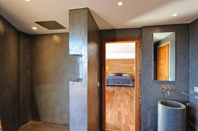 Double bedroom with sea view, terrace access, queen-size bed and Ensuite bathroom with sink, shower and Toilets in the corridor