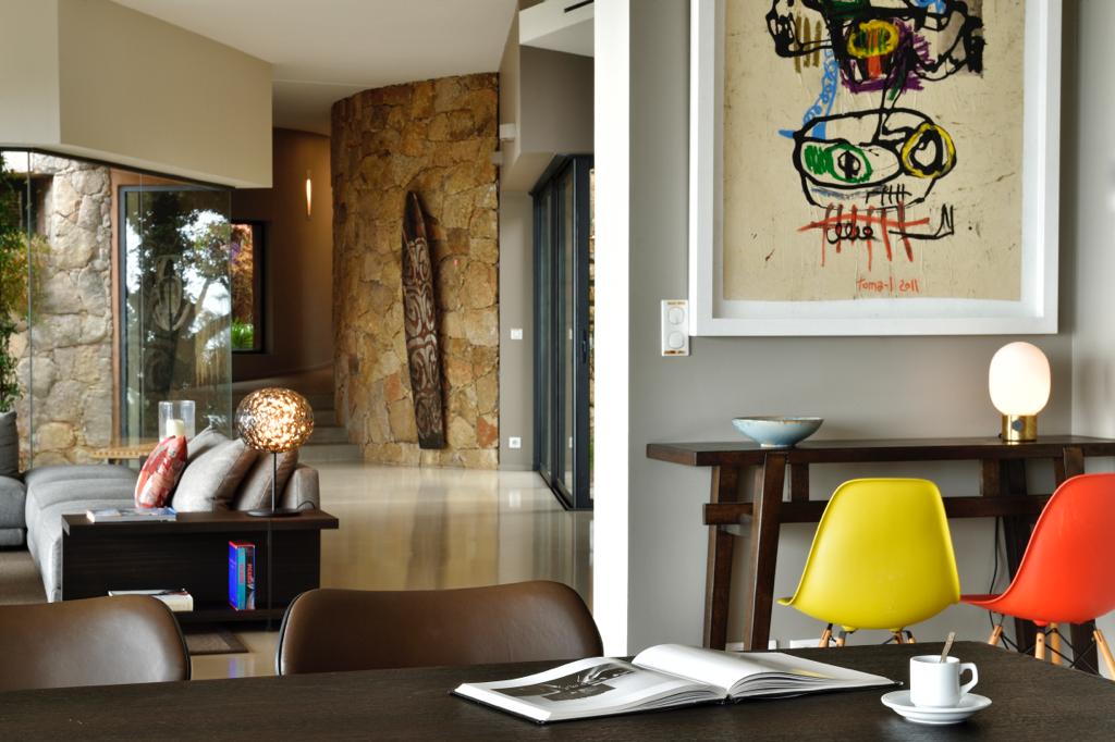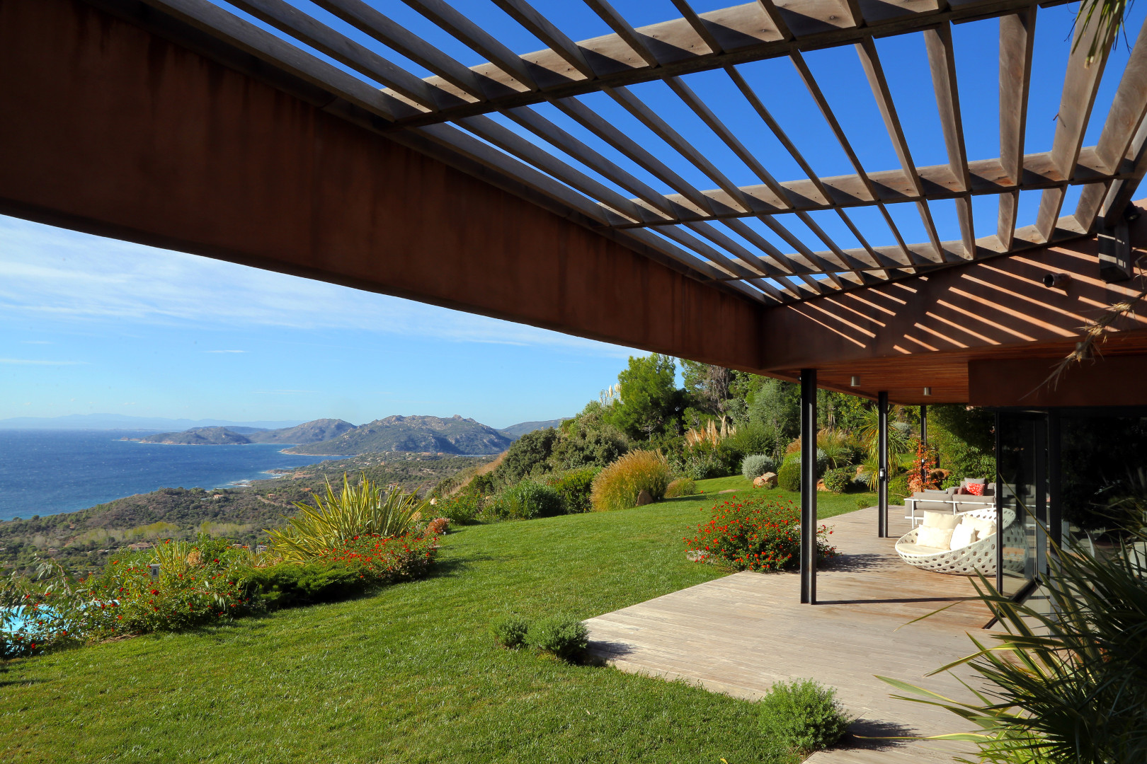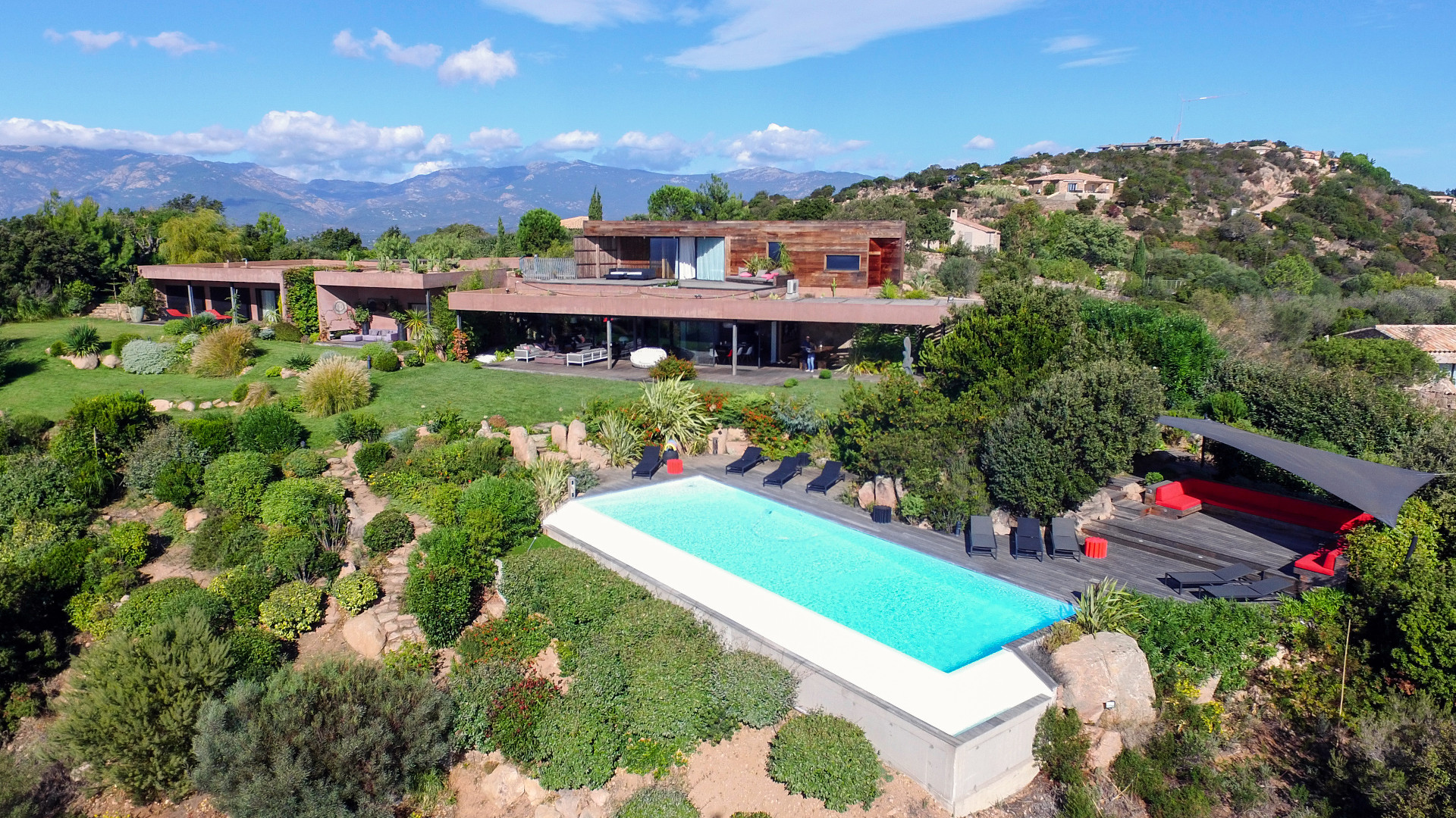 This luxurious villa, furnished in a great refinement, is the work of a recognized architect. The spaces are fabulously joined together, and the open facades in black metal and red walls give the house its natural side. The interior of the house offers furniture of high-end brands (and high quality!), but also offers an exceptional view on the sea from the lounge, the garden and terraces, and finally from the pool overlooking the hill .