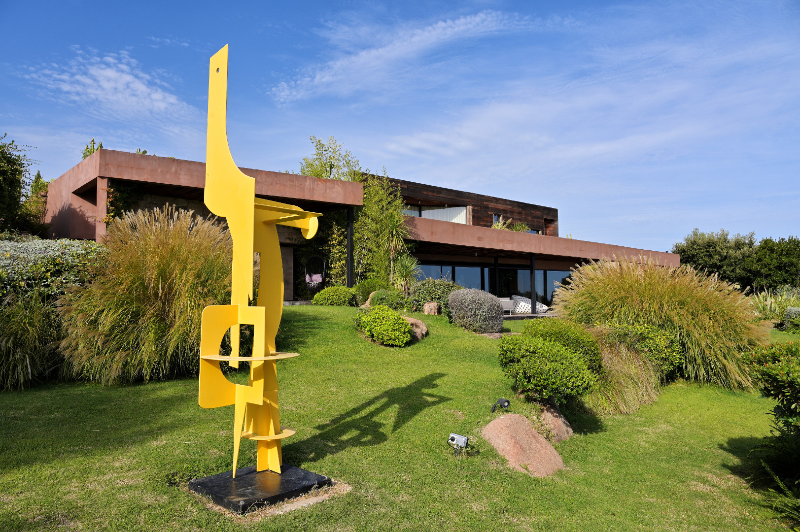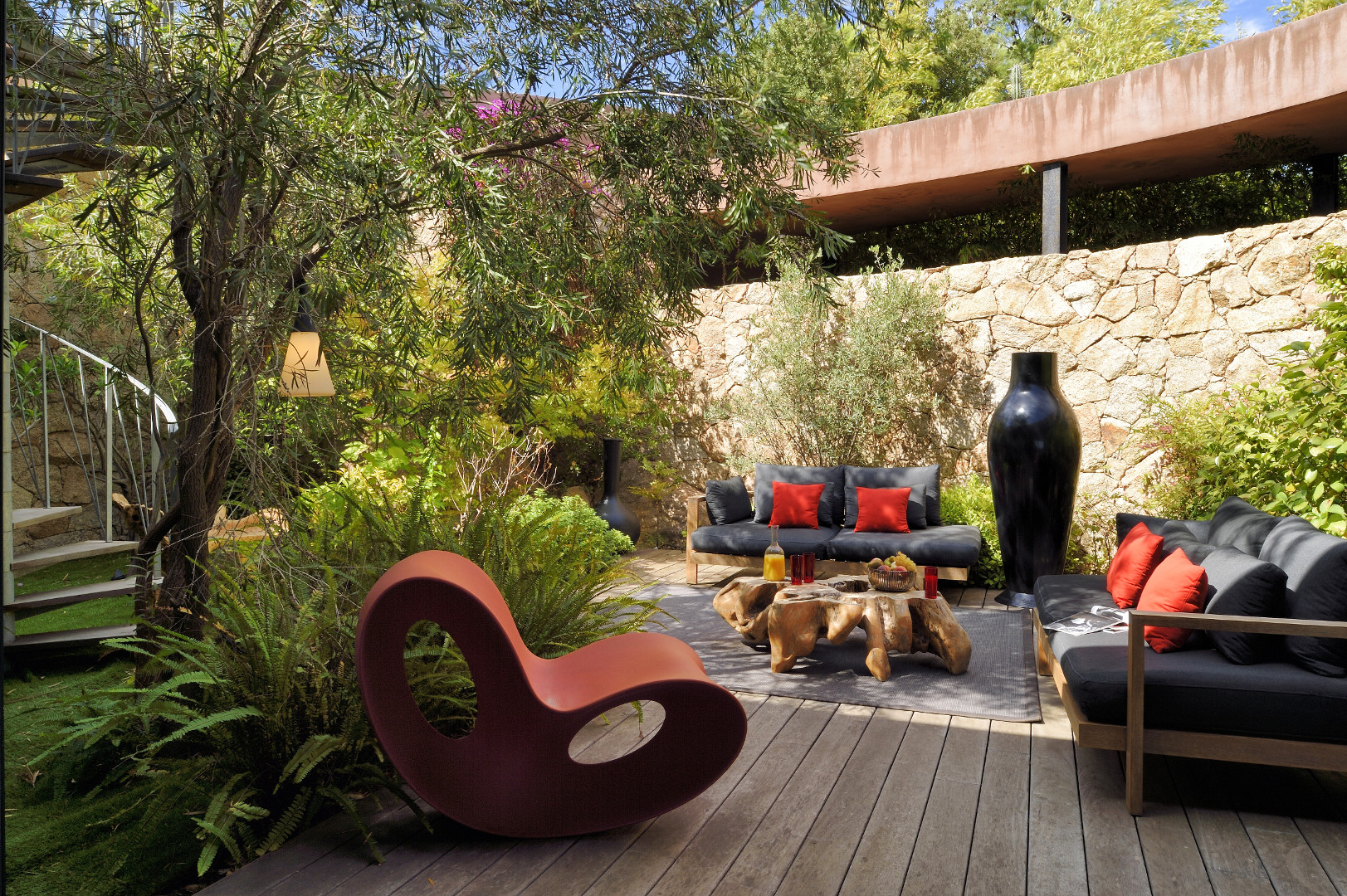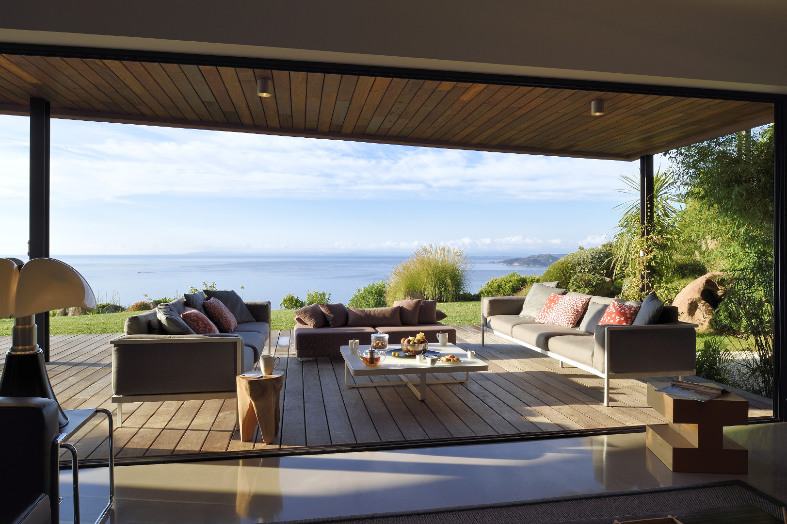 This luxurious villa, furnished in a great refinement, is the work of a recognized architect. The spaces are fabulously joined together, and the open facades in black metal and red walls give the house its natural side. The interior of the house offers furniture of high-end brands (and high quality!), but also offers an exceptional view on the sea from the lounge, the garden and terraces, and finally from the pool overlooking the hill .