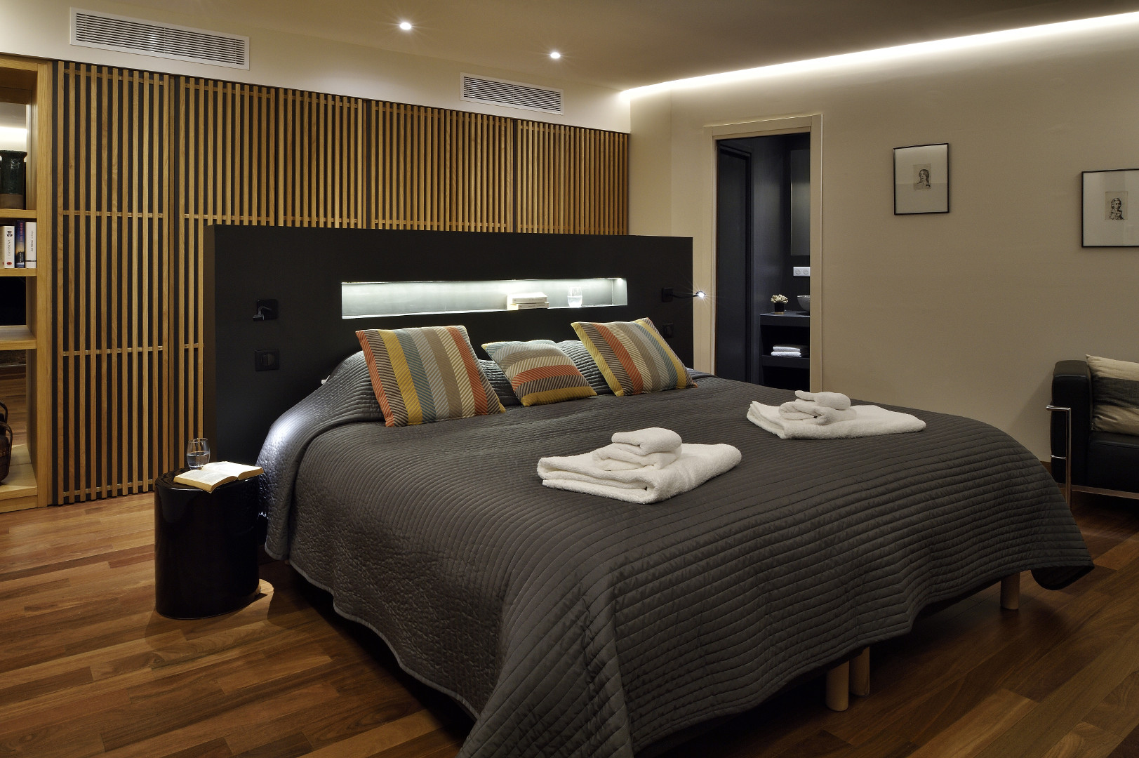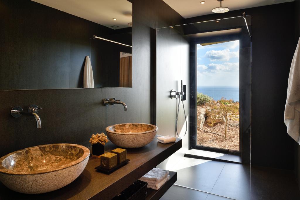 Double bedroom with sea view, terrace access, queen-size bed and Ensuite bathroom with wc, bath, double sink, shower