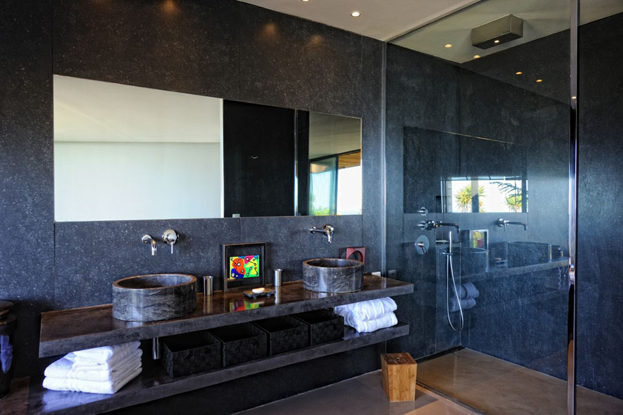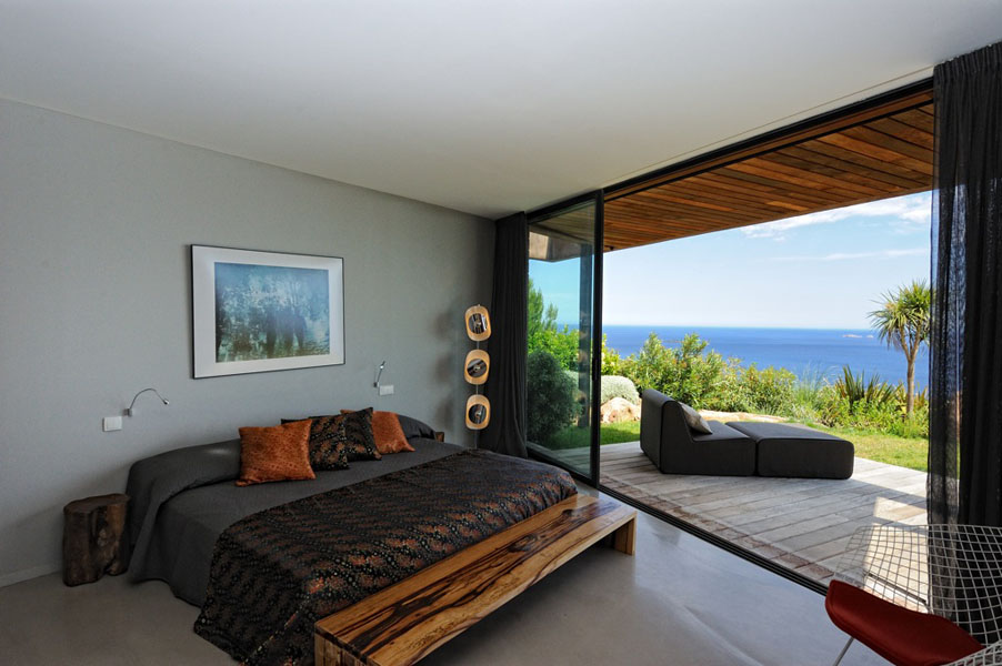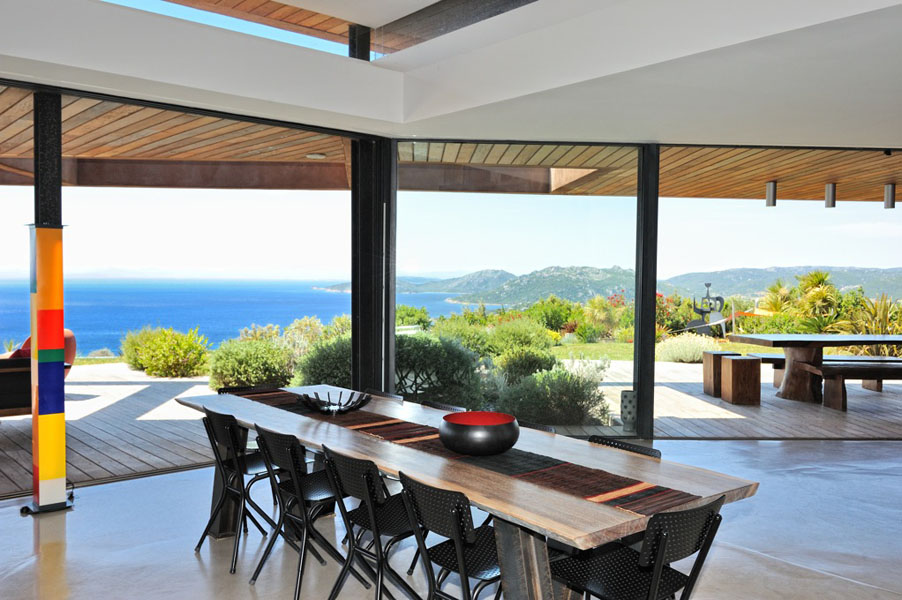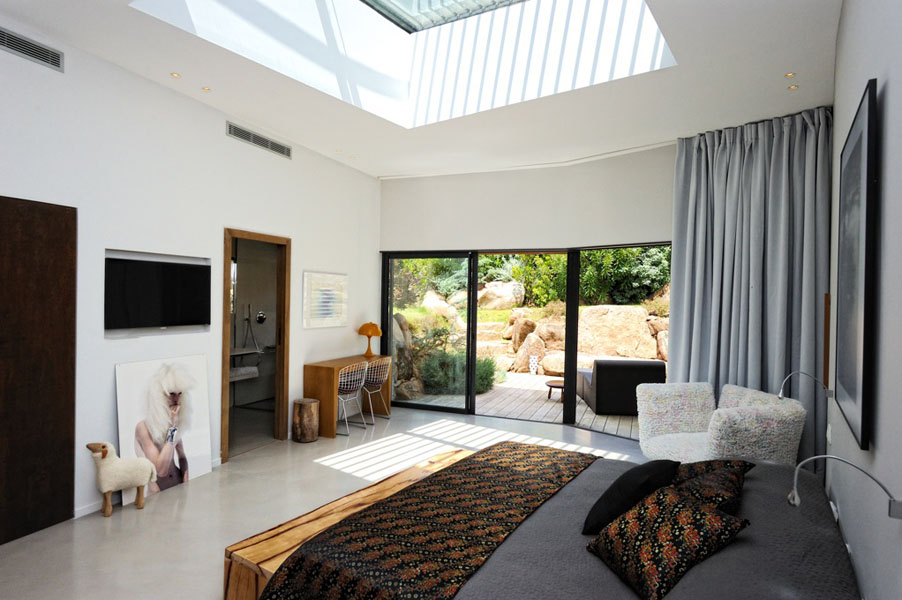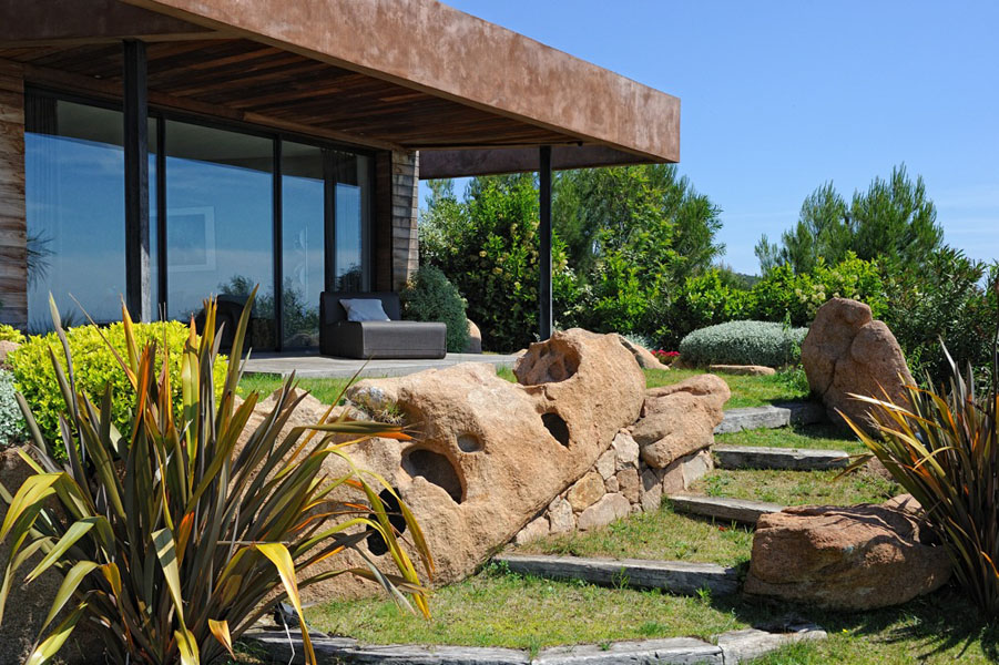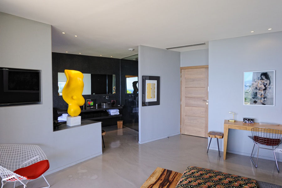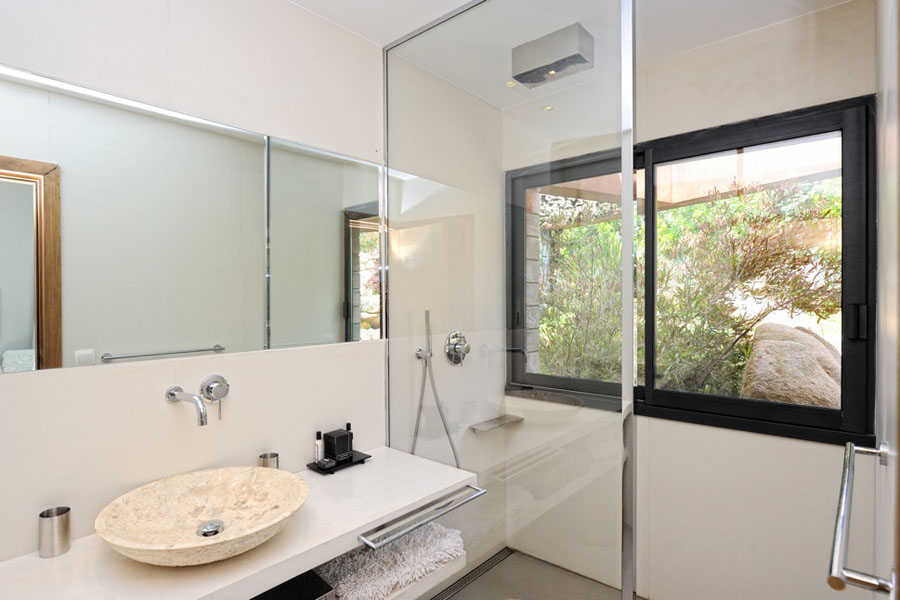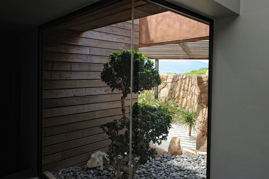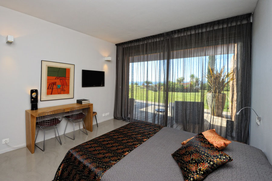 The studio has a triple bedroom ( 3 single beds), a kitchen, and like the main house, boasts total A/C (floor heating available off season as well). The multimedia equipment is also very satisfying: 4 plasmas screens, in-and-outdoor speaker system. Original and top quality linen and furniture. Moreover, outdoors spaces will enchant you as well: the pool is 18 meters long, heated, and covered. The garden of 5000 sqm is totally landscaped: Modern Art sculptures, manicured lawn, numerous varieties of trees and vegetation, very harmoniously tended between the modernity of the house, and the wild aspect of the Corsican “maquis”.