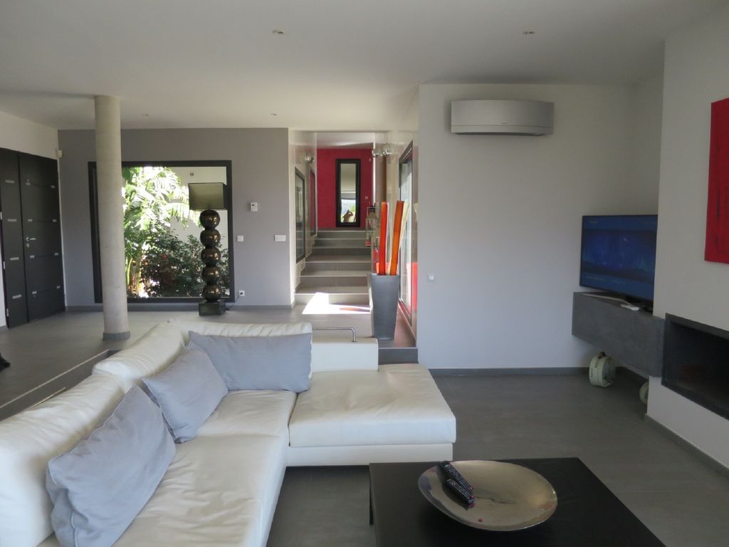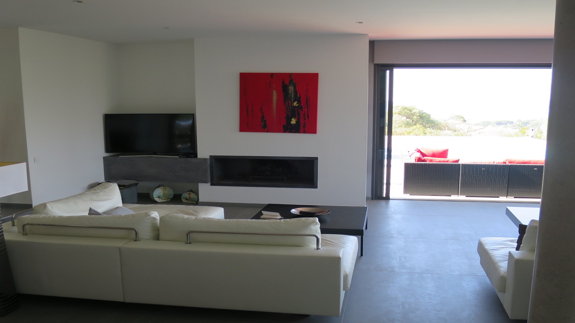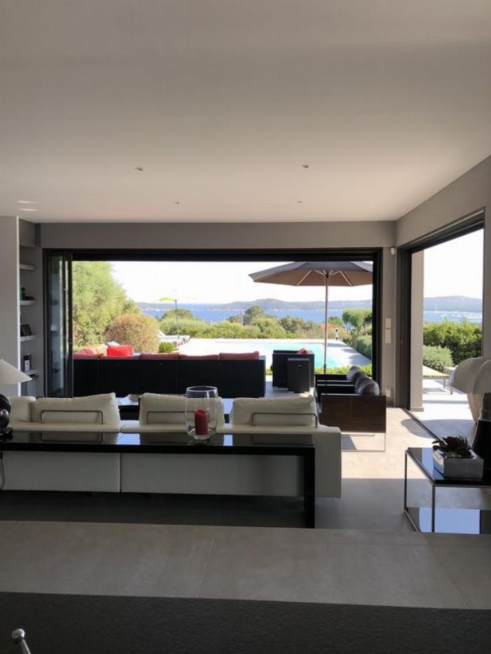 Living Room with two large sofas (12 seats) and large french windows opening onto terraces with lcd tv, pool view, sea view, air conditioning, hifi system, terrace access, satellite, fire place