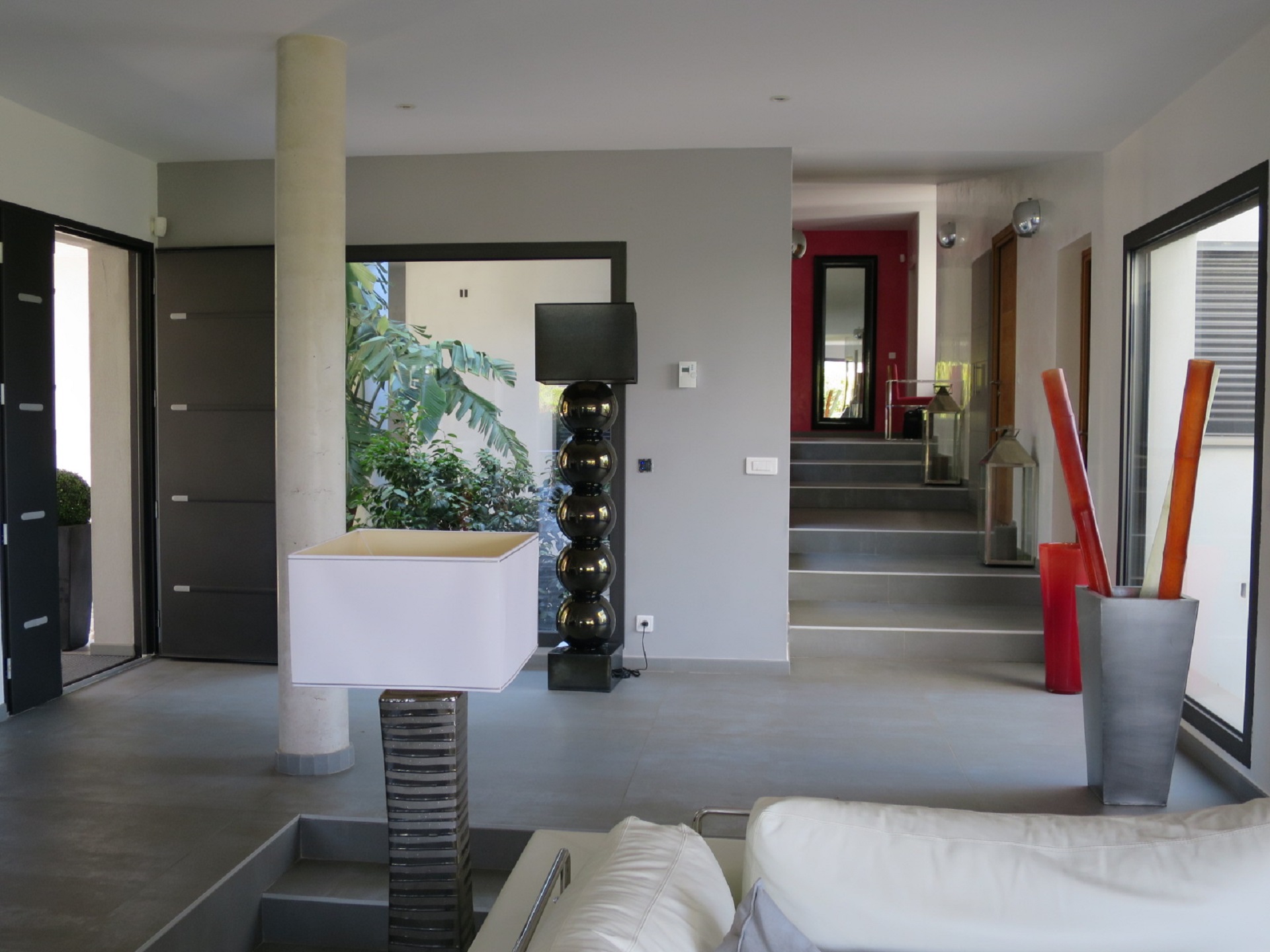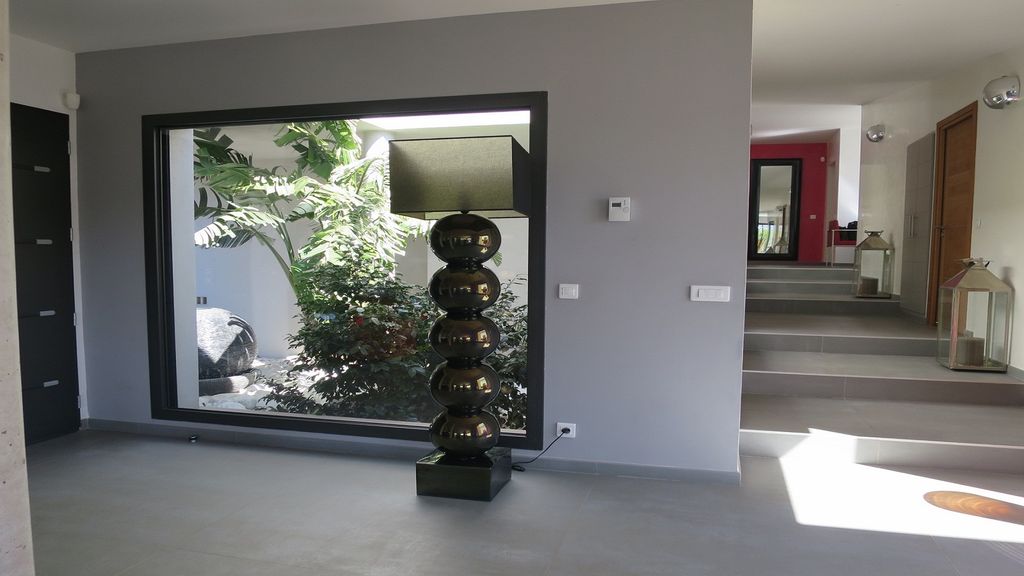 The show-stopper is undoubtedly the vast living room, whose wide picture windows blend seamlessly with the picturesque natural setting, a harmonious fusion of swimming pool, scrubland and sea.