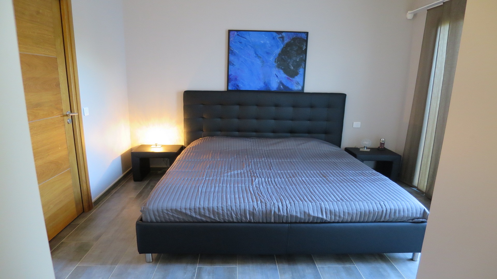 Double bedroom access by 3 steps with queen-size bed, walk-in closet, cot, balcony and Ensuite bathroom with wc, sink, shower