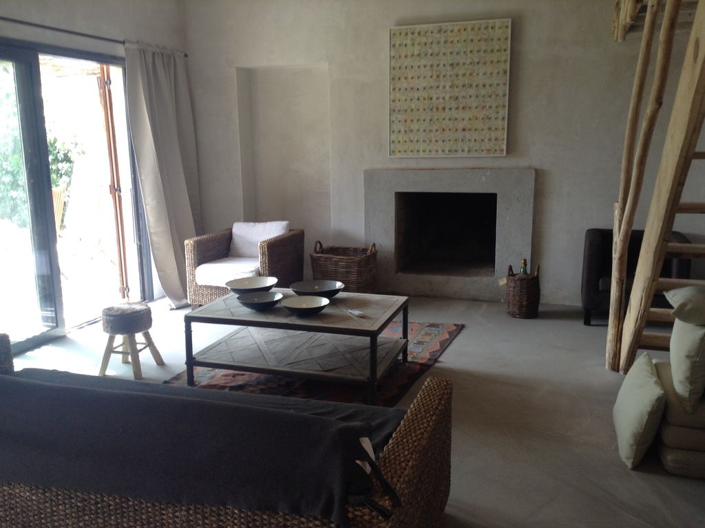 Living Room with stairs which lead to mezzanine level with fire place, satellite, television, air conditioning and Dining Room can seat 10 people