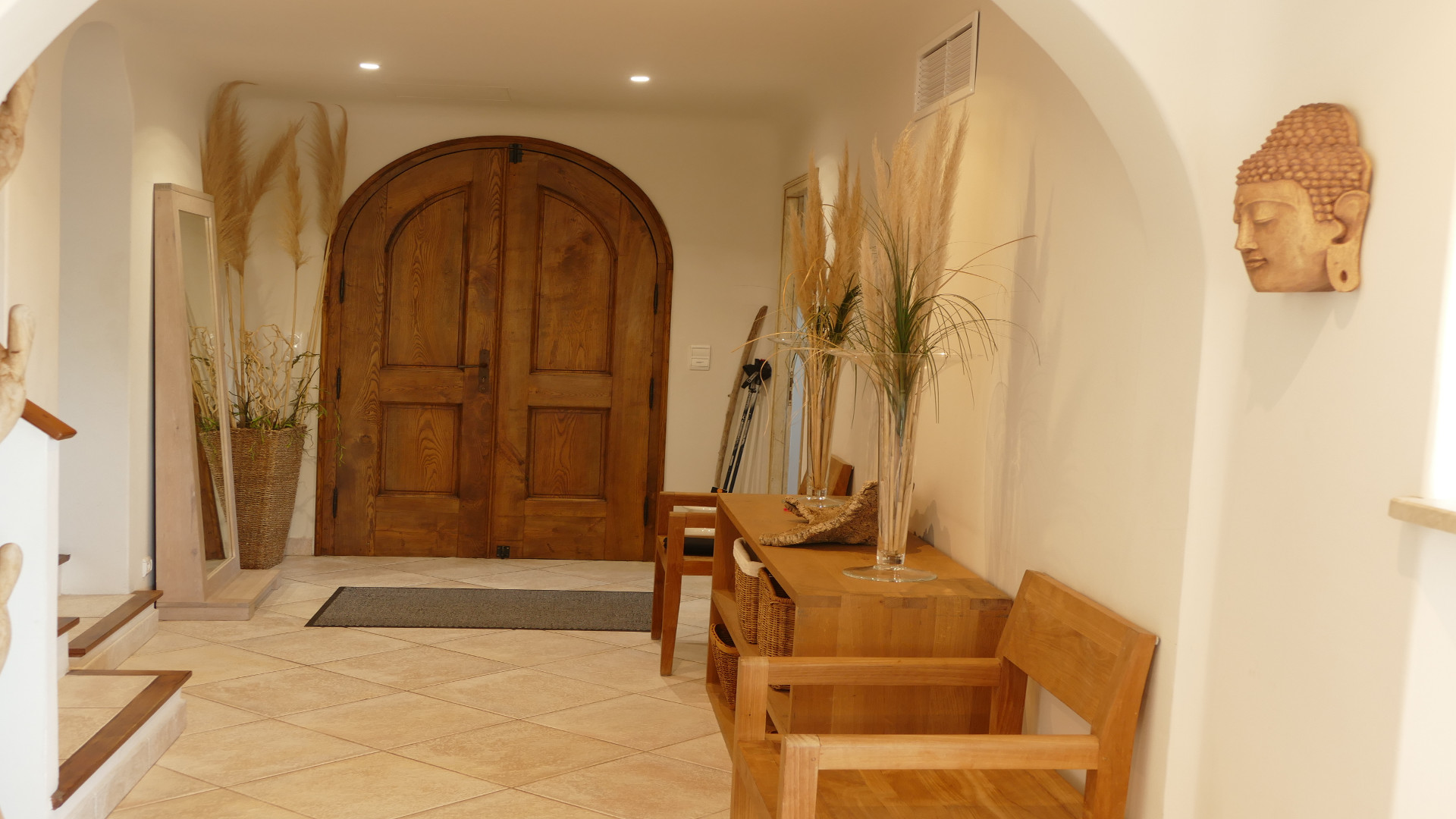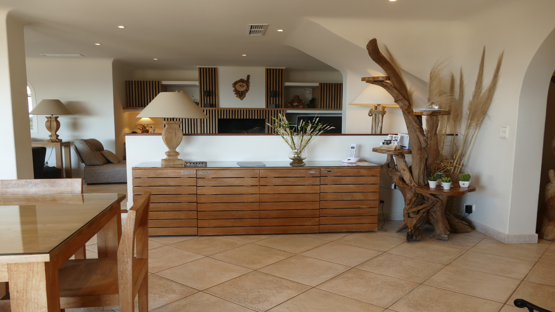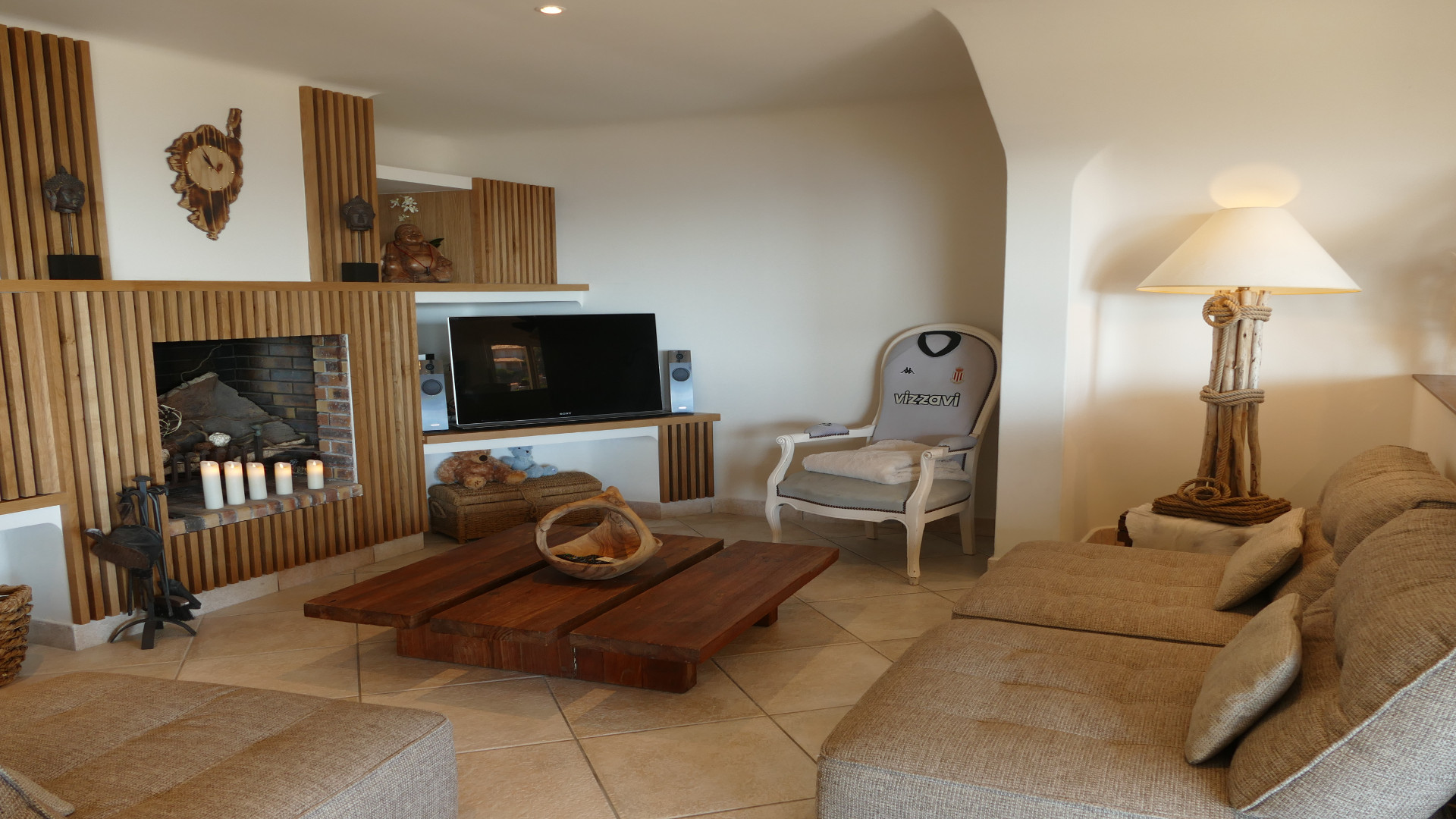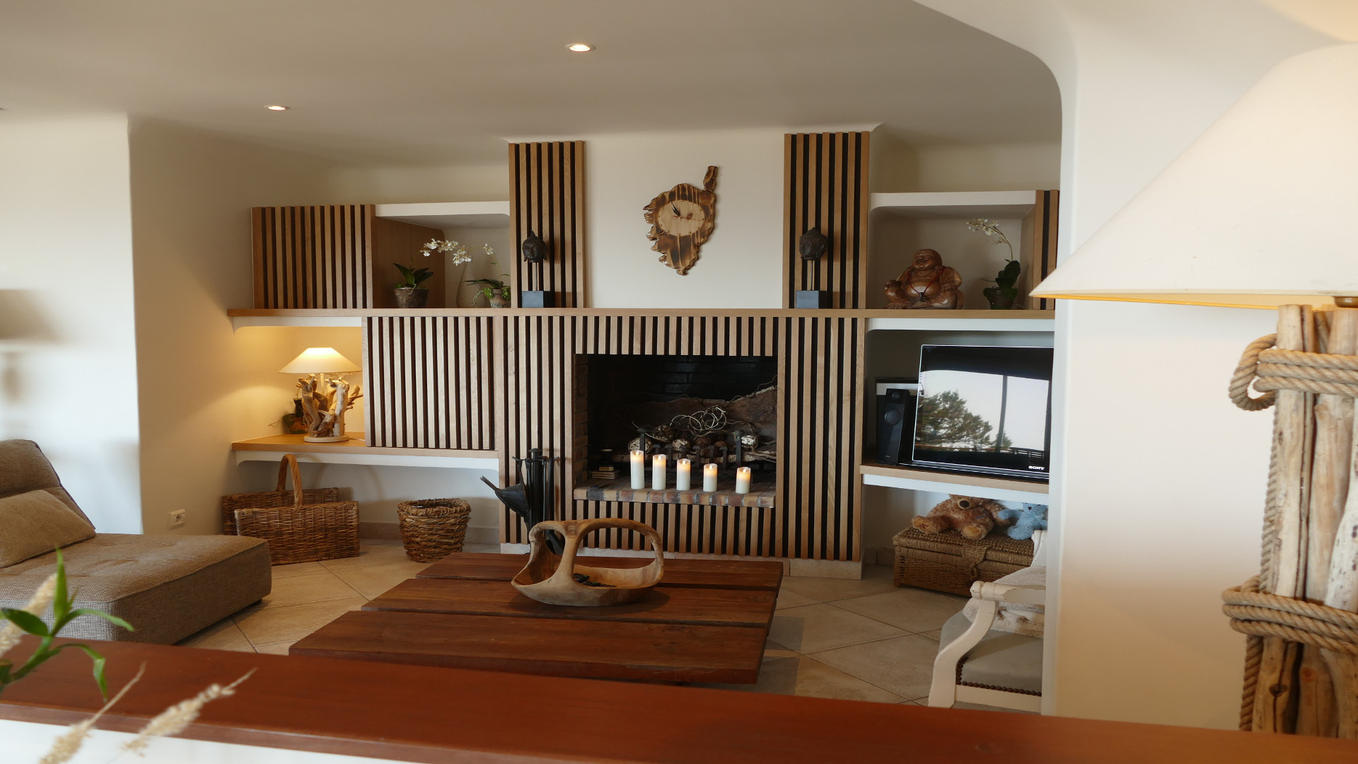 Passing by the door of the villa you find a large living space with a dining area and a fully equipped open kitchen on the left and two living rooms on the right, one of them very cosy with a fireplace.