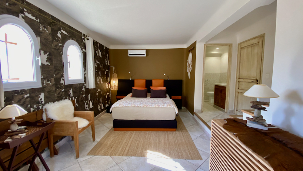 Double bedroom with sea view, queen-size bed, television and Bathroom with wc, shower