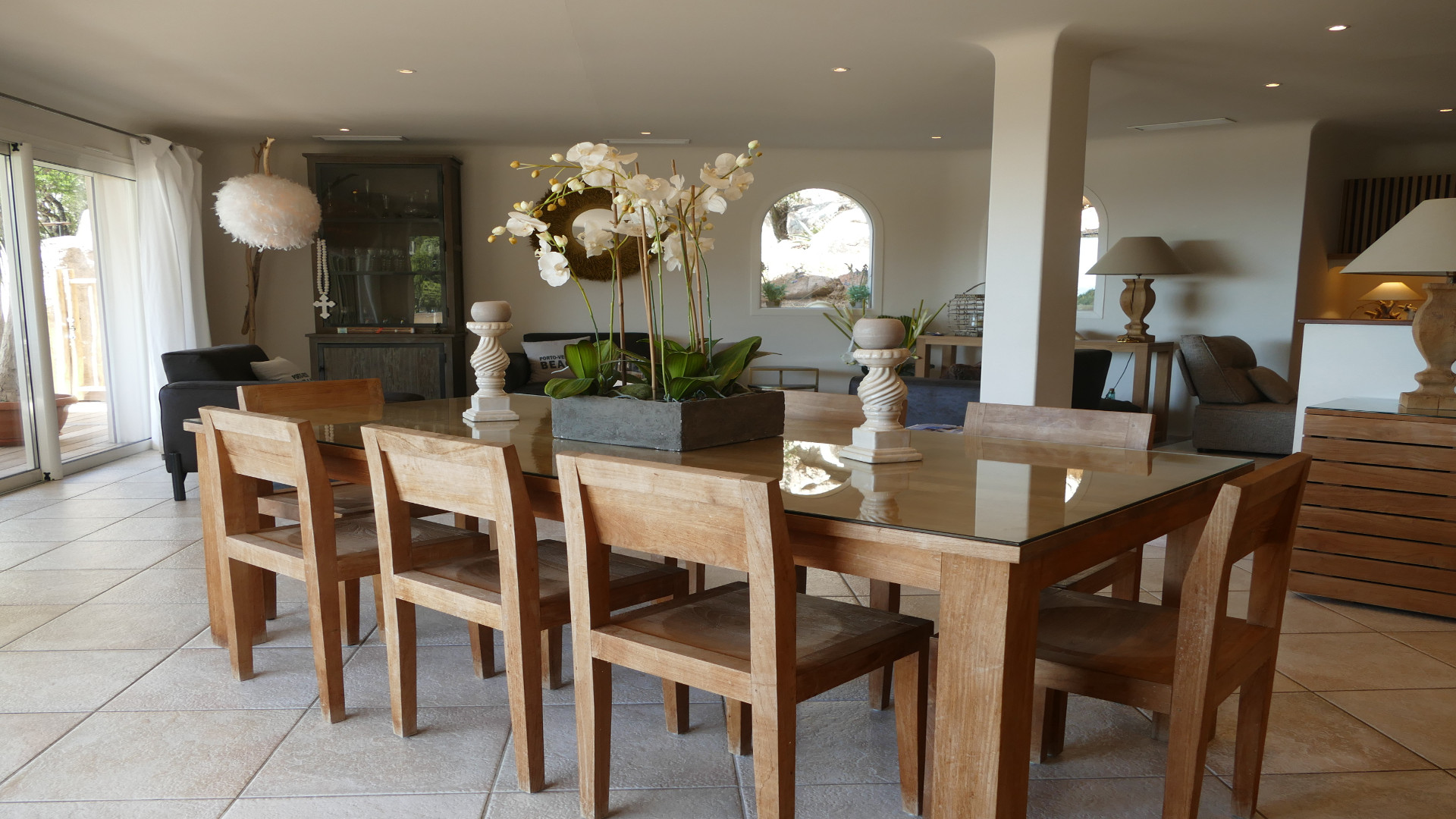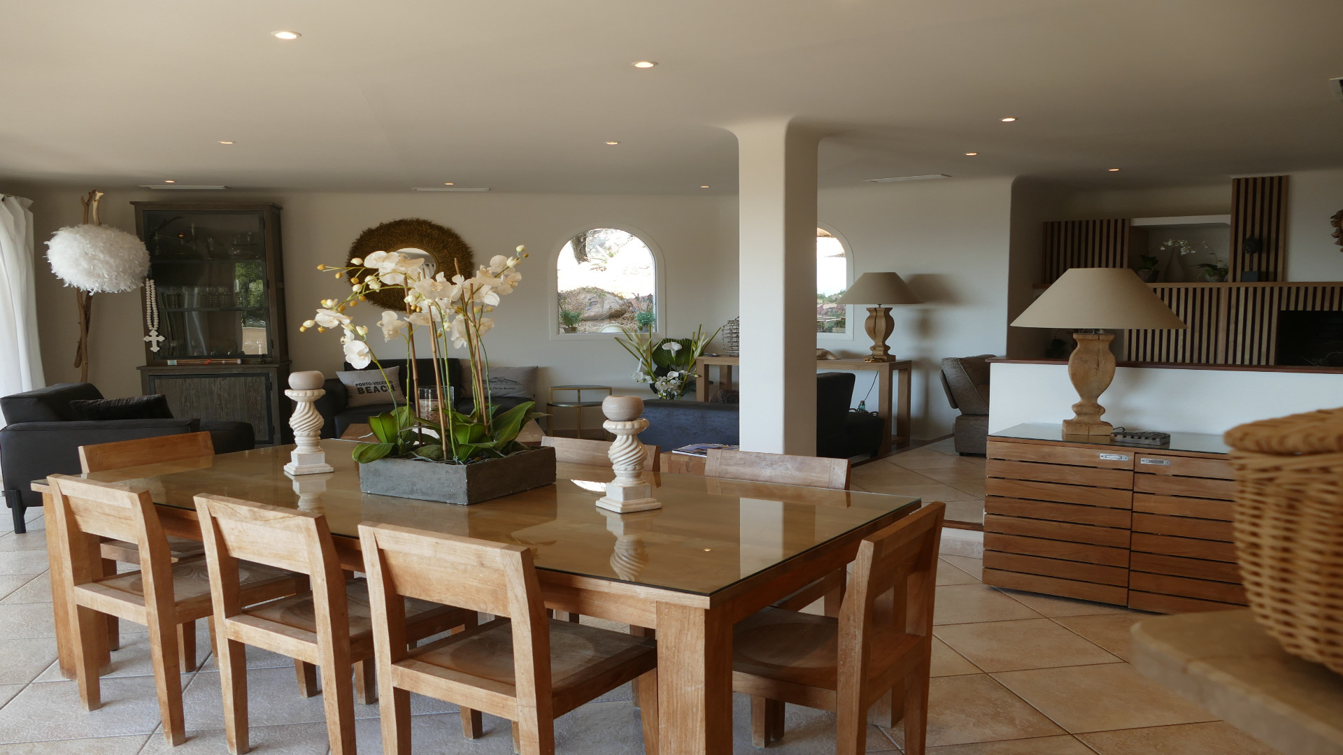 A bay window gives access to the terrace with a living corner and a dining area, few steps lead to the heated pool with breathtaking view on the sea. Some more steps give access, in a panoramic position, to the very well equipped pool house. It's the perfect place to enjoy of this little paradise.