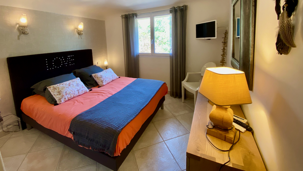 Double bedroom with television, queen-size bed and Bathroom with shower, wc