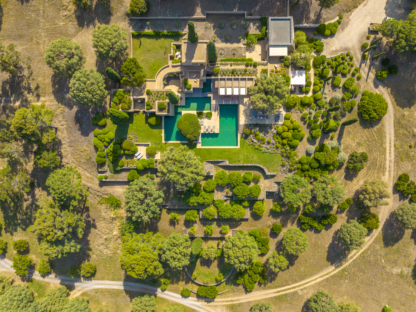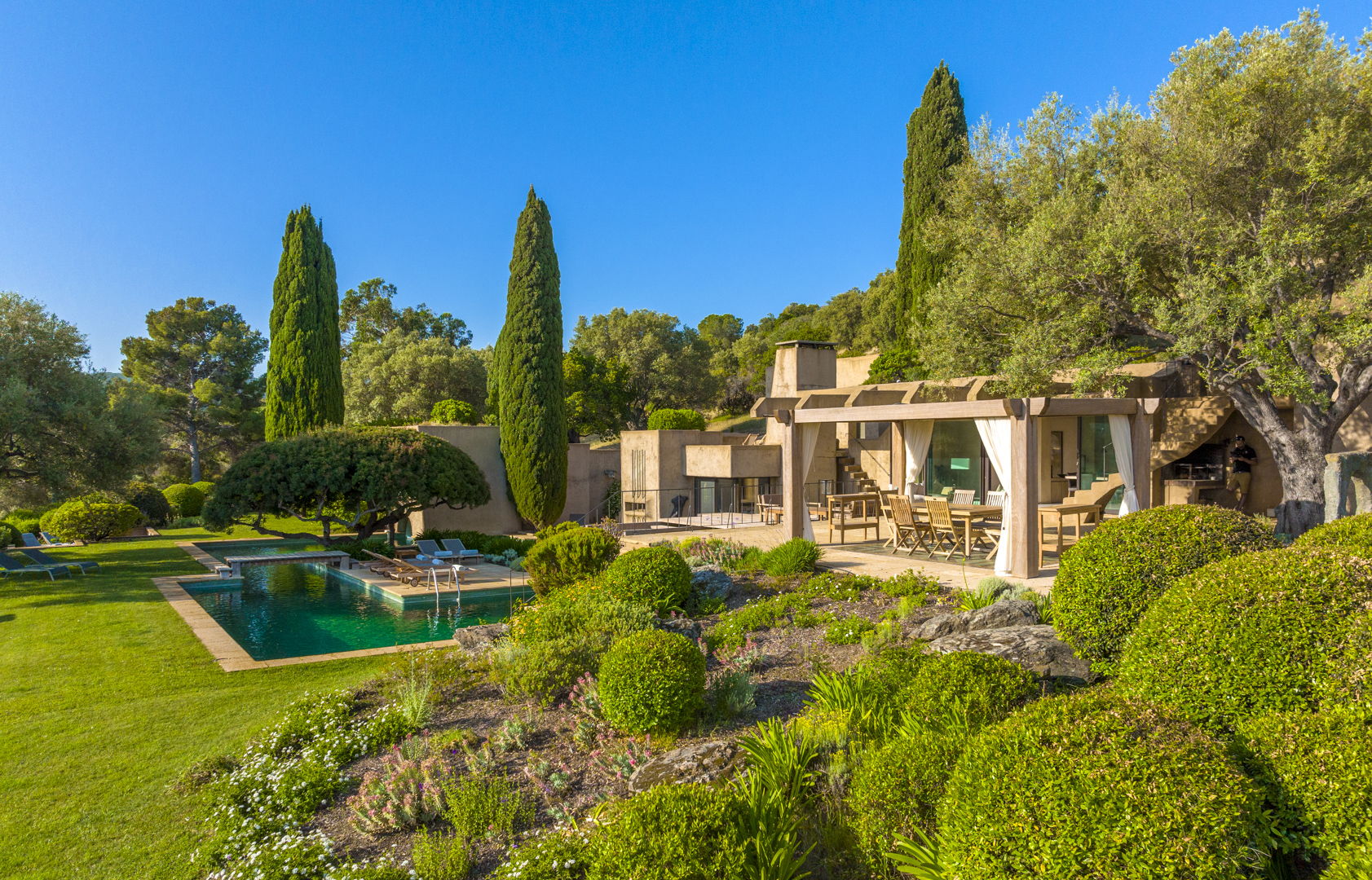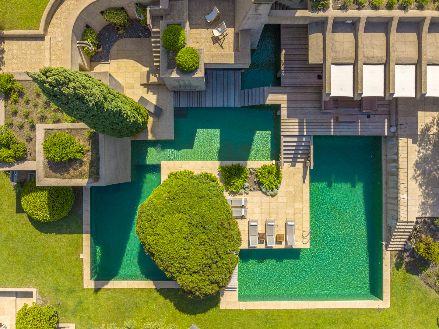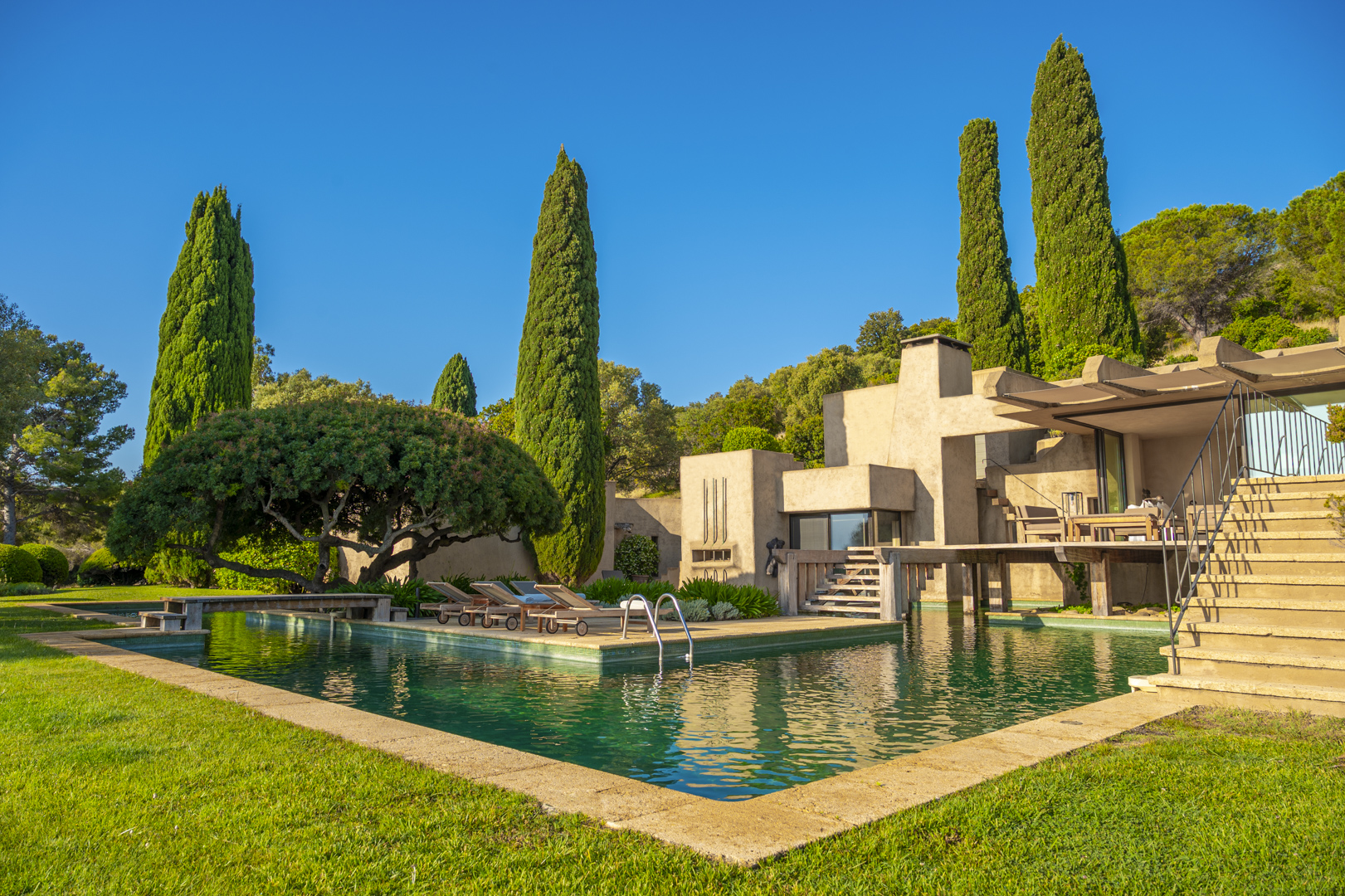 Architect's house built in the 80s, this property is quite amazing. The surface of the swimming pools reaches a total of nearly 250 sqm, and a whole game of swimming lane runs through the gardens and terraces. From the inside of the master bathroom, it is possible to get in the water and swim to the terraces of the living room. The distant sea view is omnipresent from most rooms, as well as the lush vegetation. The property has been the subject of several reports on architecture and extraordinary Mediterranean gardens, this house is simply unique.