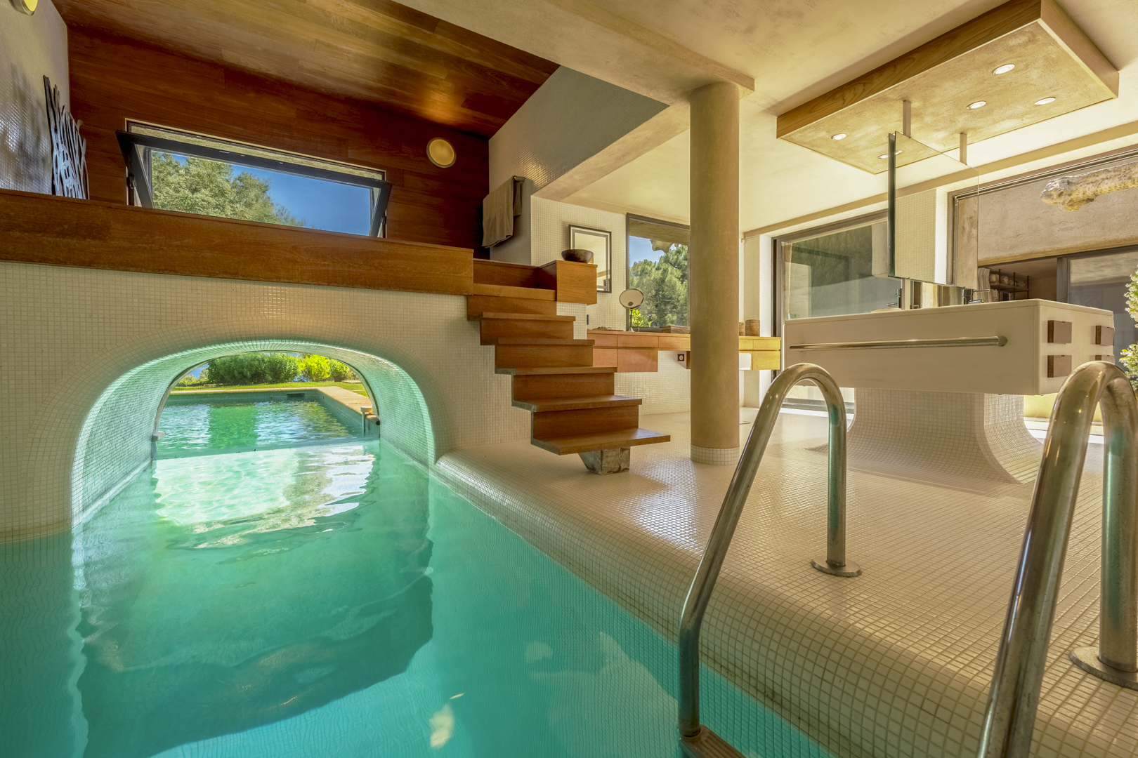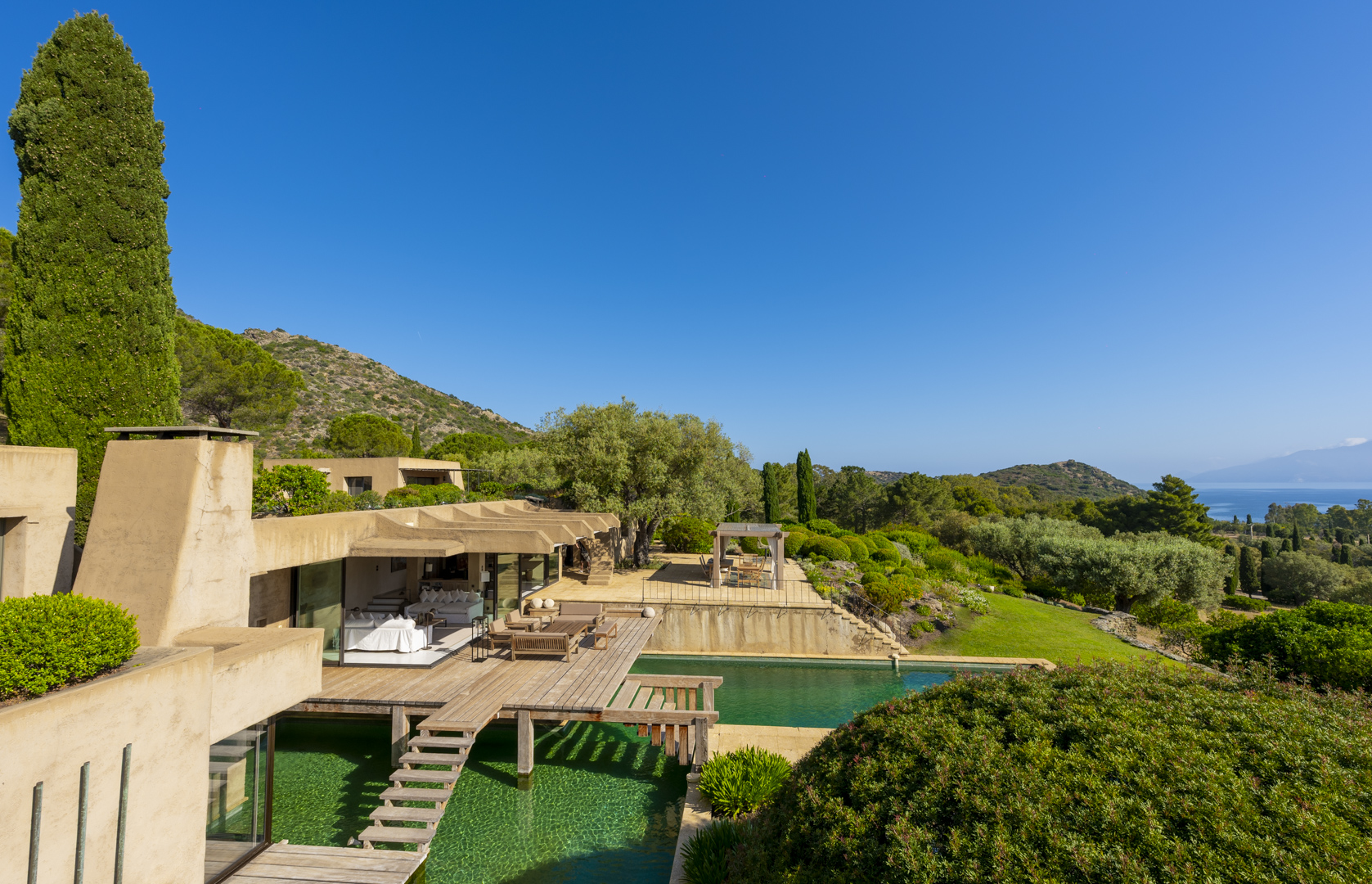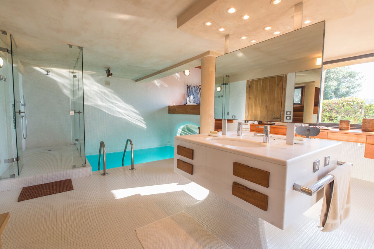 Architect's house built in the 80s, this property is quite amazing. The surface of the swimming pools reaches a total of nearly 250 sqm, and a whole game of swimming lane runs through the gardens and terraces. From the inside of the master bathroom, it is possible to get in the water and swim to the terraces of the living room. The distant sea view is omnipresent from most rooms, as well as the lush vegetation. The property has been the subject of several reports on architecture and extraordinary Mediterranean gardens, this house is simply unique.