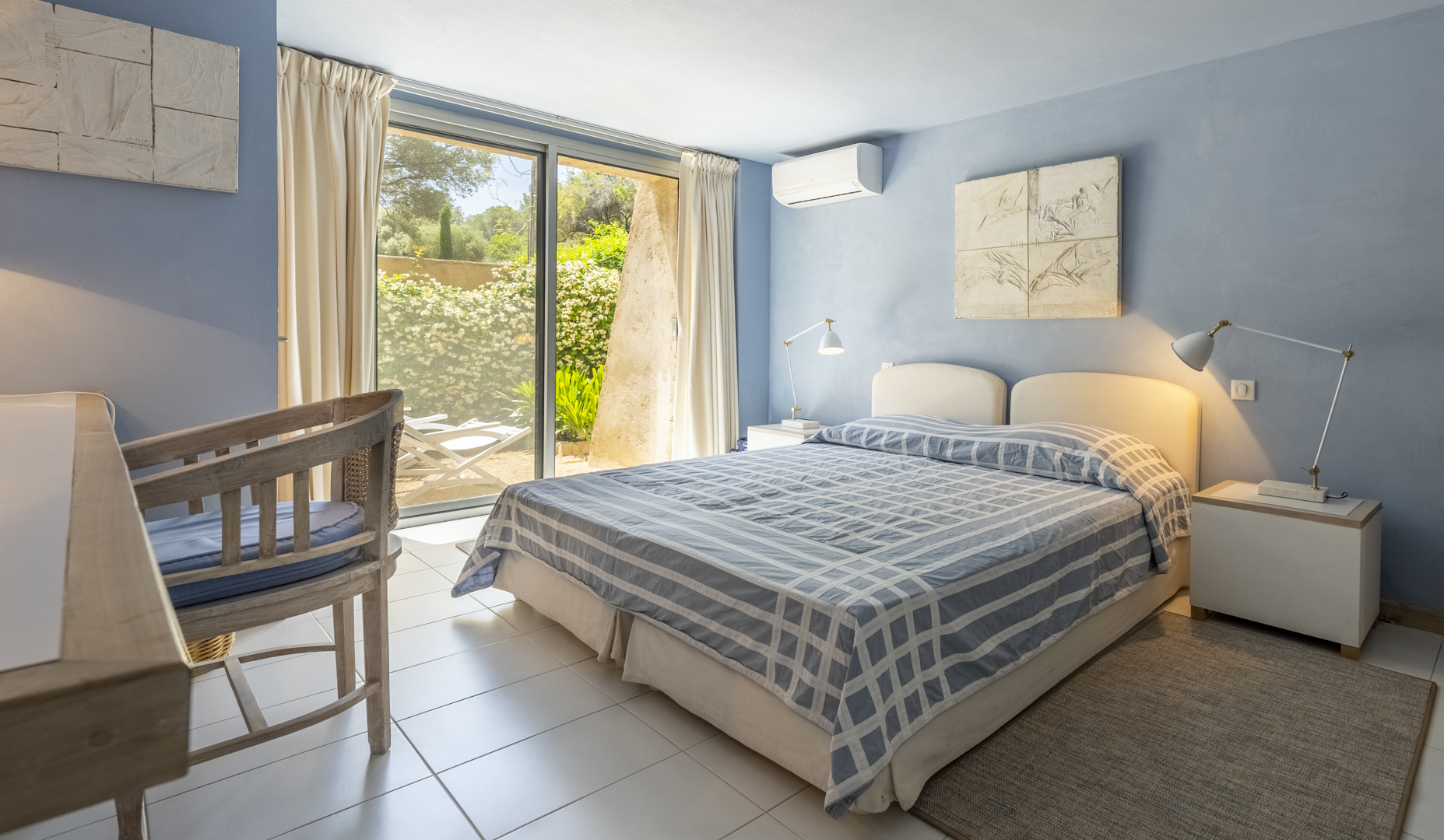 Twin bedroom bleu with access to a patio - convertible into a double with office corner, garden view, air conditioning, internet access and Independant Bathroom with shower, bidet, wc