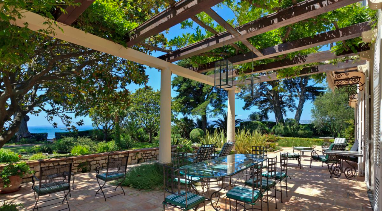 Terrace with outdoor dining and lounge area overlooking park and sea