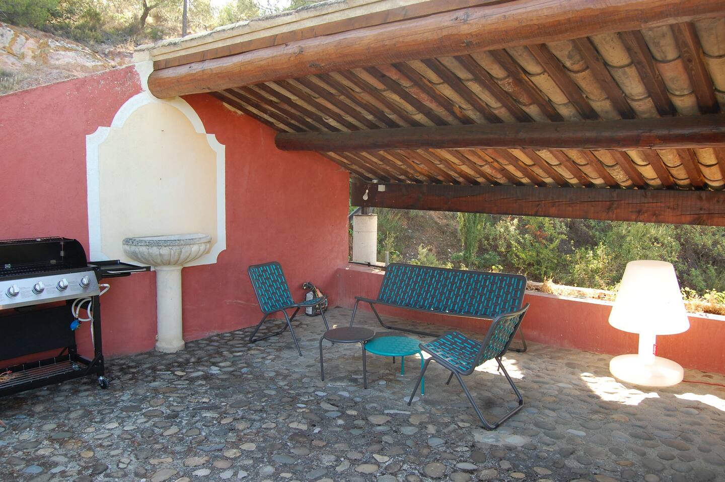 Covered and equipped Terrace with deckchairs, barbecue, countryside view