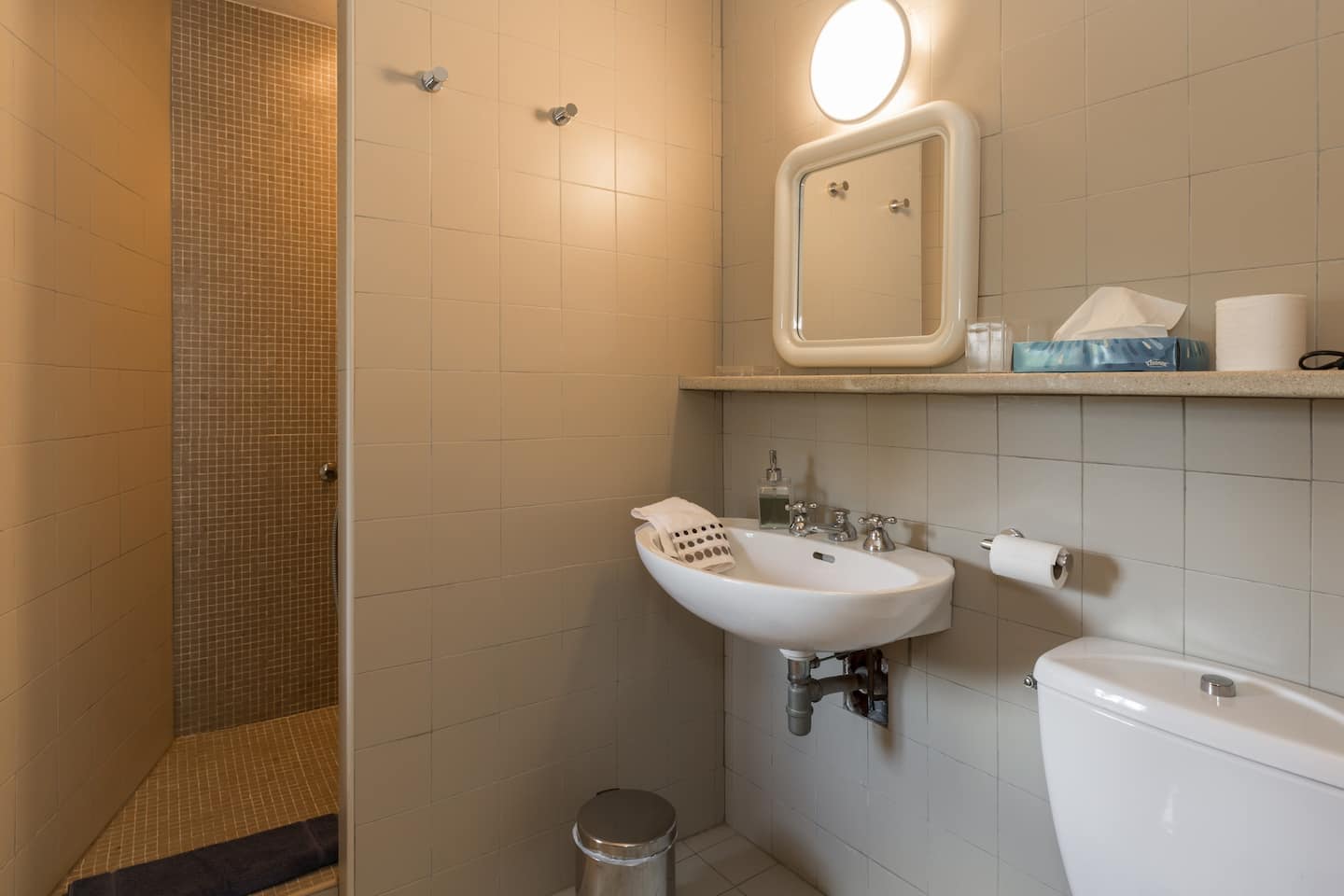 Double bedroom with queen-size bed, terrace access and Ensuite bathroom with shower, wc