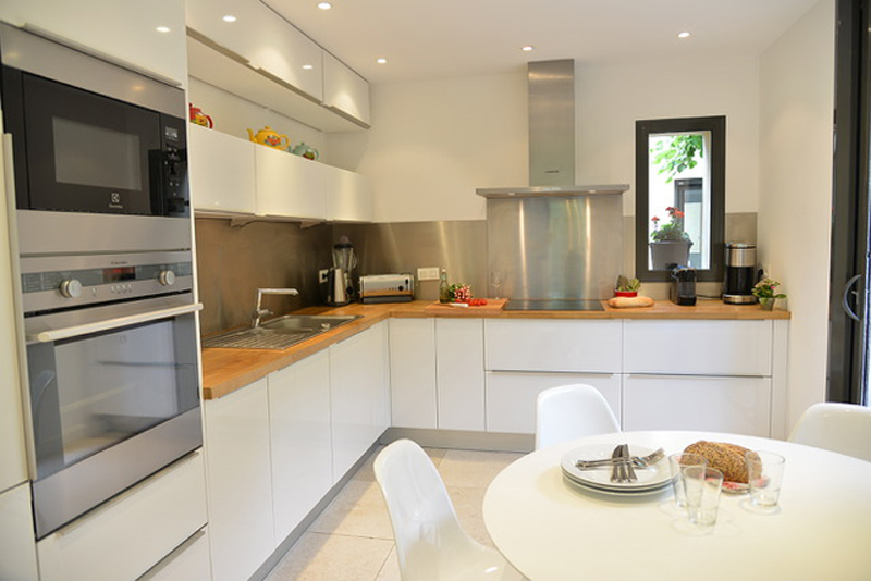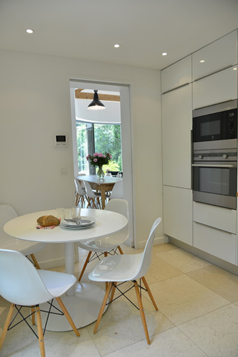 Kitchen with dining area with table for 4 guests with electric oven, nespresso machine, toaster, kettle, induction hob, microwave oven, dishwasher, freezer, fridge