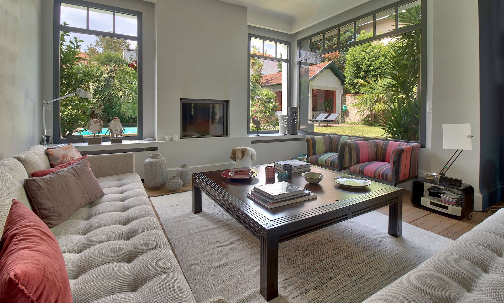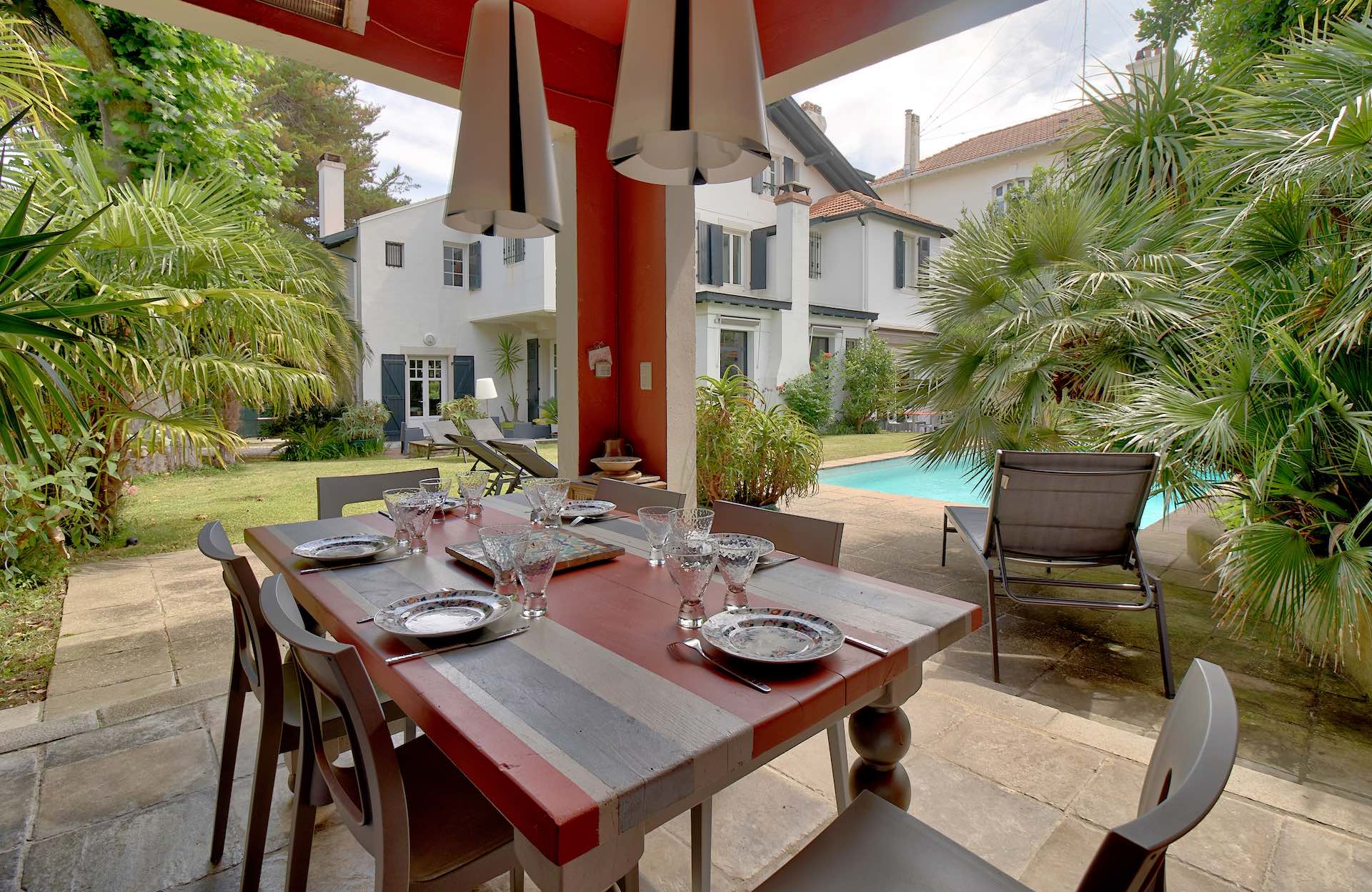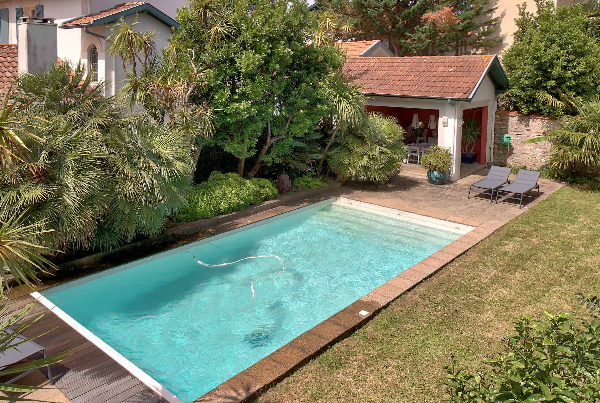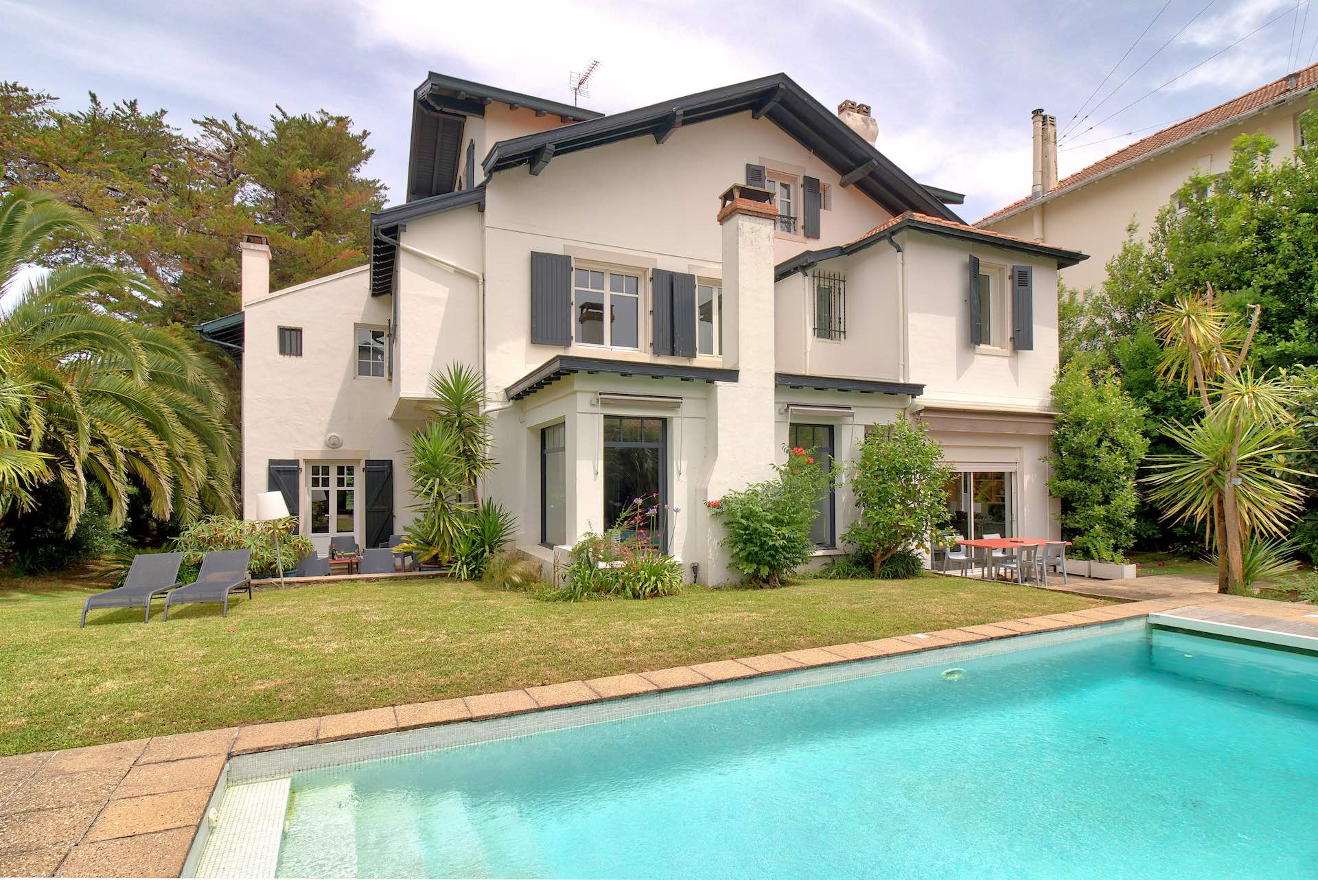 Beautiful old property with Basque architecture located in the center of Biarritz, 800 meters from the beaches and 100 meters from the shops. It has a pretty garden with a private heated swimming pool and its pool-house. A covered terrace is fitted out to take meals outside. The interiors are tastefully decorated in a bourgeois style combining noble and modern materials.