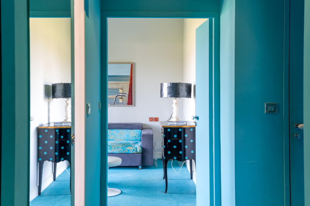 Double bedroom blue with living room area, fans and Independant Bathroom with bath, shower, double sink and Terrace private and Toilets separated
