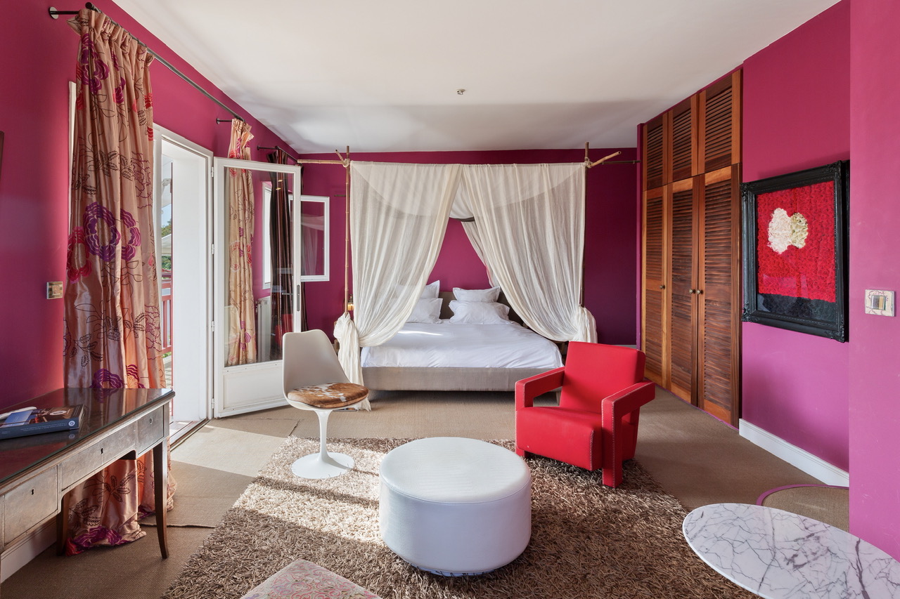 Double bedroom pink with living room area, television, fans and Ensuite bathroom with bath, sink and Terrace private and Toilets separated