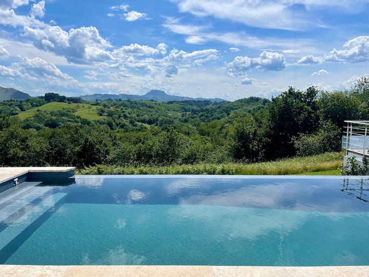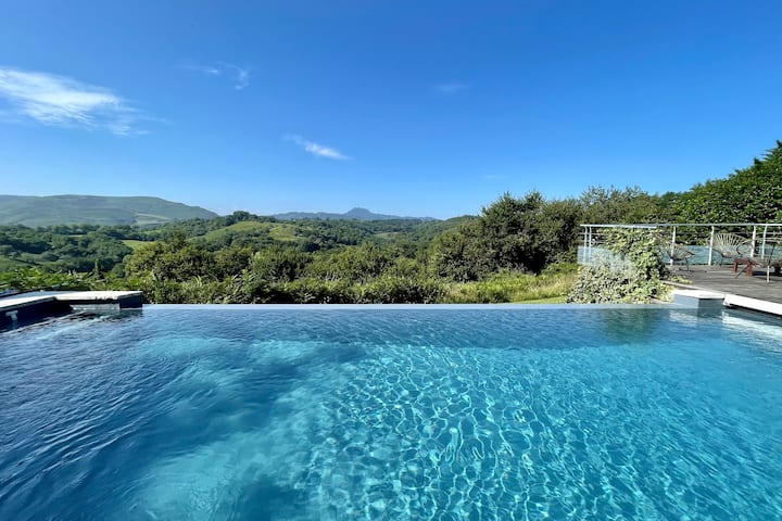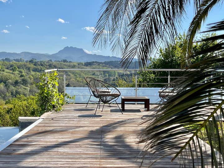 Situated on the Basque cornice, this beautiful 250 m2 villa has been completely renovated (end of may 2008) in a contemporary designed style. Unique environment spread over 2500 m2 lot, with superb panoramic views on the sea and the mountains. Ideal for all those who dreams to combine the return to the origins and the modern comfort in touristic environment. On the outside, you will enjoy the garden (south oriented) and the 2500 m2 lot which offers serenity, fullness and a view over 4 mountains (two of which are the part of the Natural French heritage).