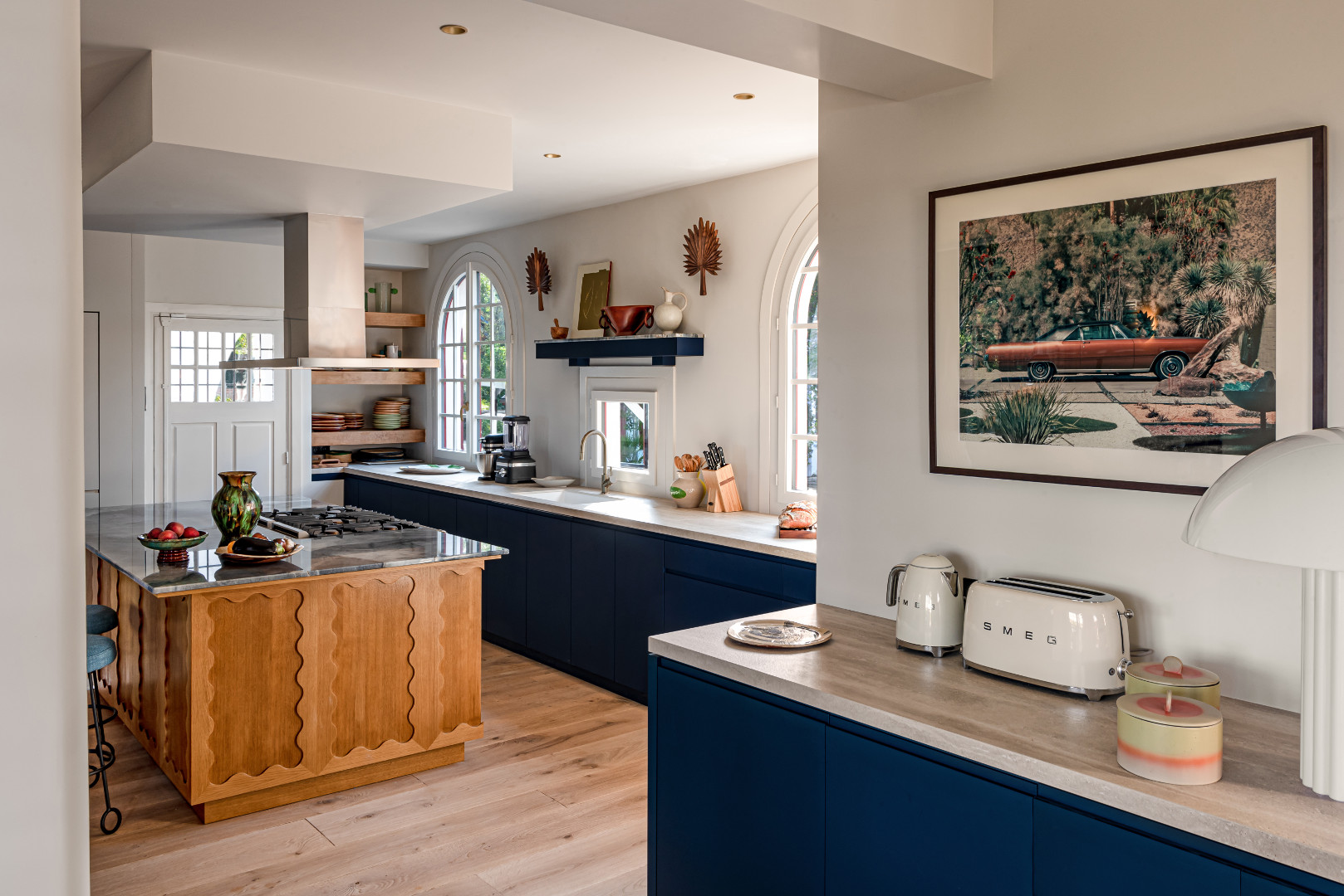 Kitchen with dining area with gas stove, gas oven, dishwasher, kettle, coffee machine, toaster, fridge, freezer, microwave oven