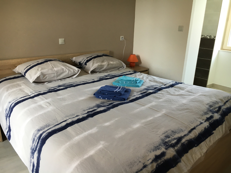 Double bedroom with queen-size bed and Shared bathroom with bath, wc, sink, shower