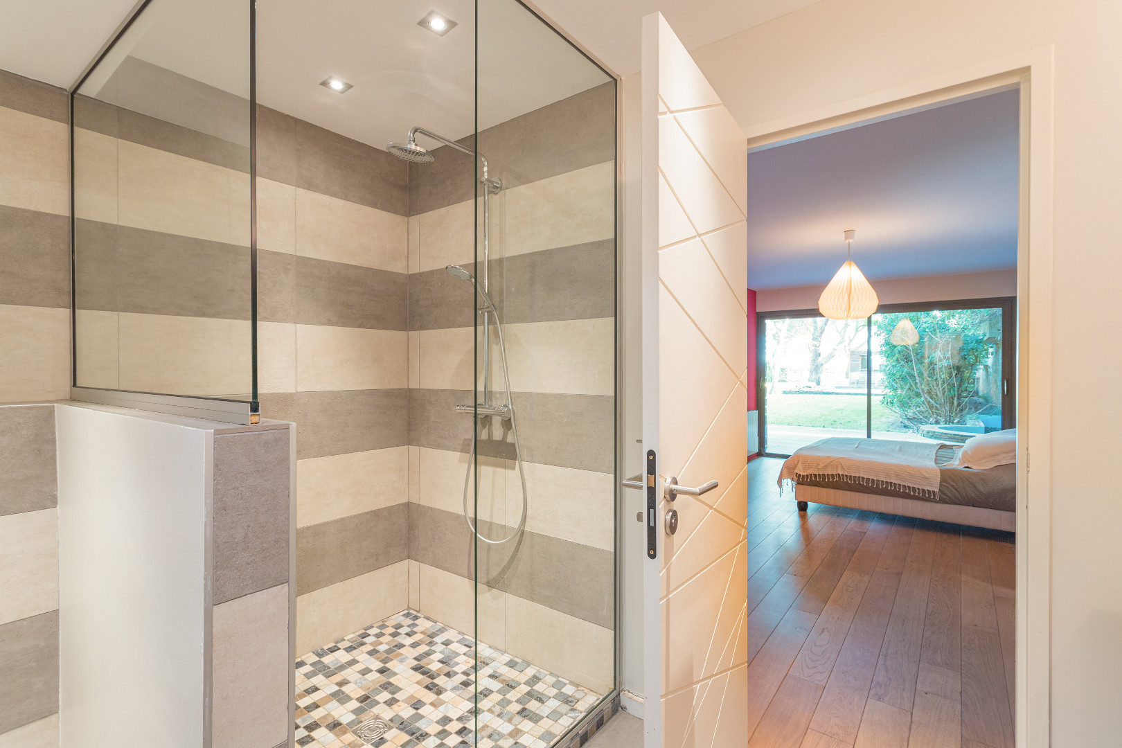 Double bedroom with queen-size bed, terrace access, garden access and Ensuite bathroom with shower