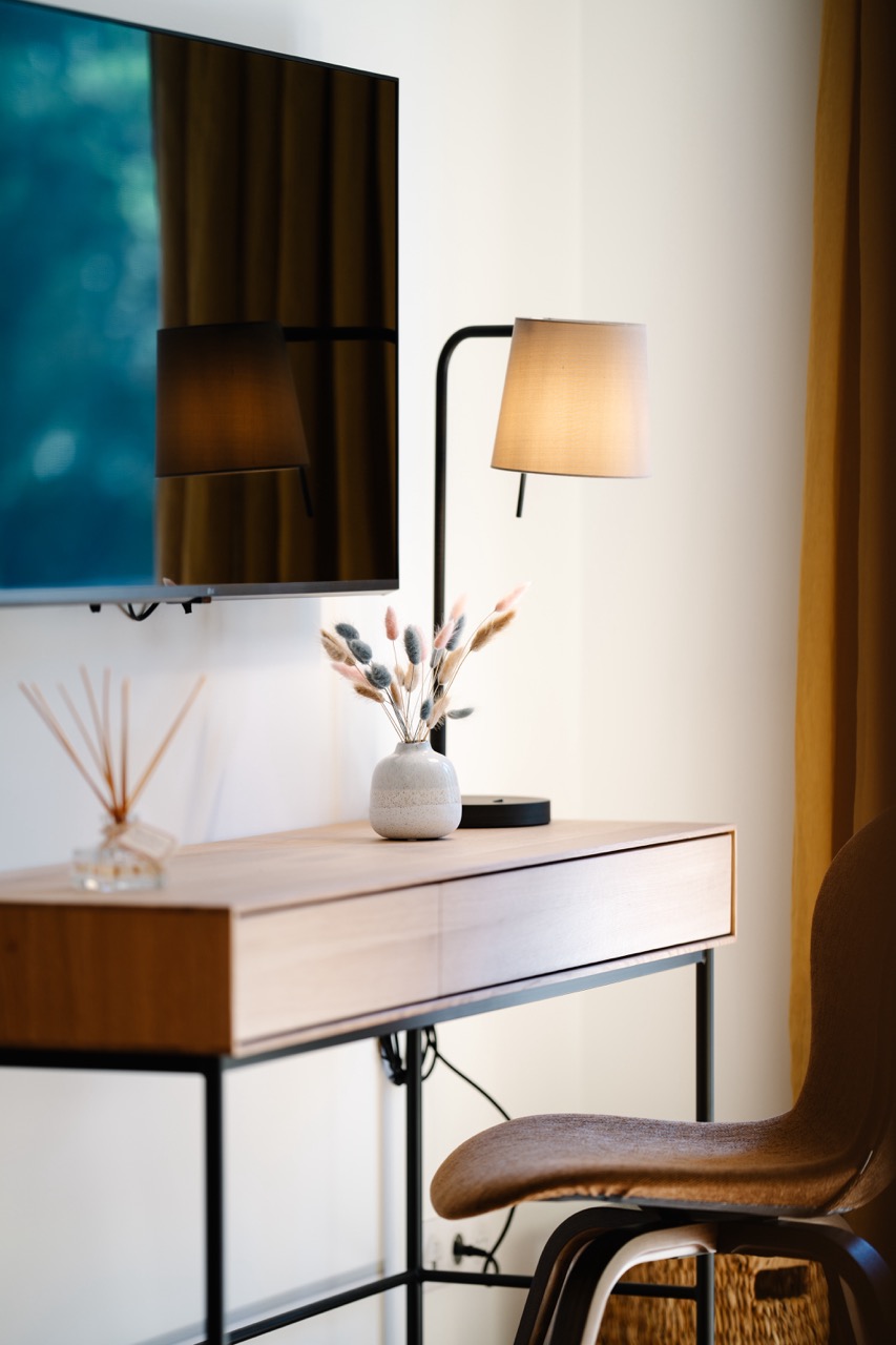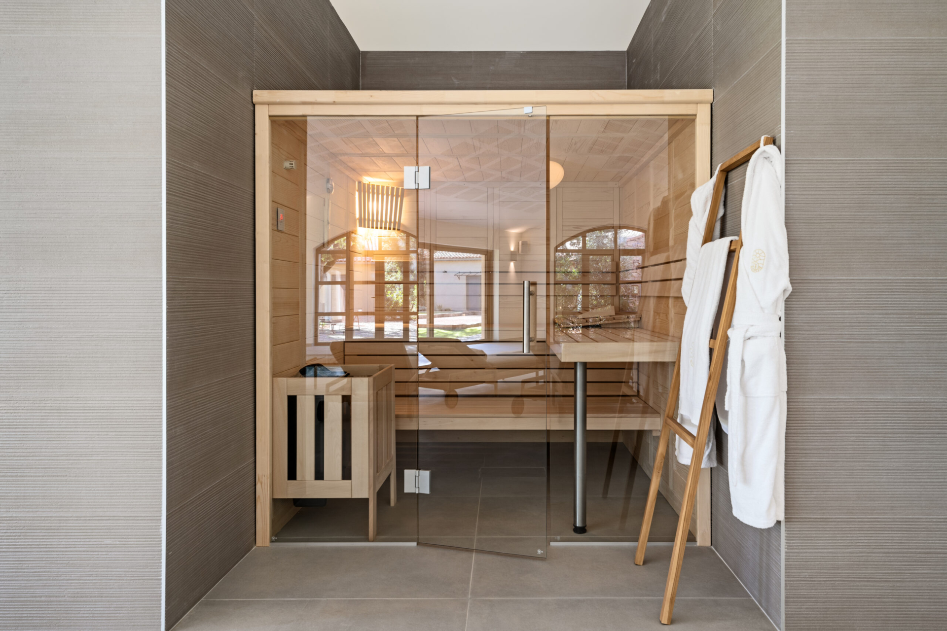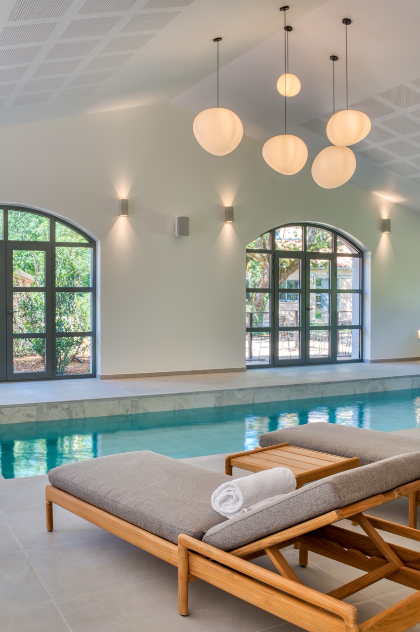 Well-being is at the heart of the experience: heated indoor pool, sauna, fitness area, private massage room, and a large outdoor pool, secured and surrounded by loungers. Numerous activities are available on-site: tennis court, pétanque court, electric bike rental, walks through the vineyards, wine tastings, and access to nearby golf courses.