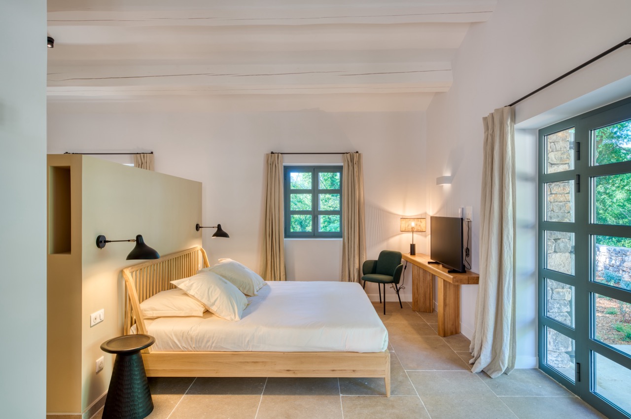 o Suite 1: king-size bed (180cm), en-suite bathroom open to the bedroom (walk-in shower, bathtub, double sink), toilet, and private terrace
