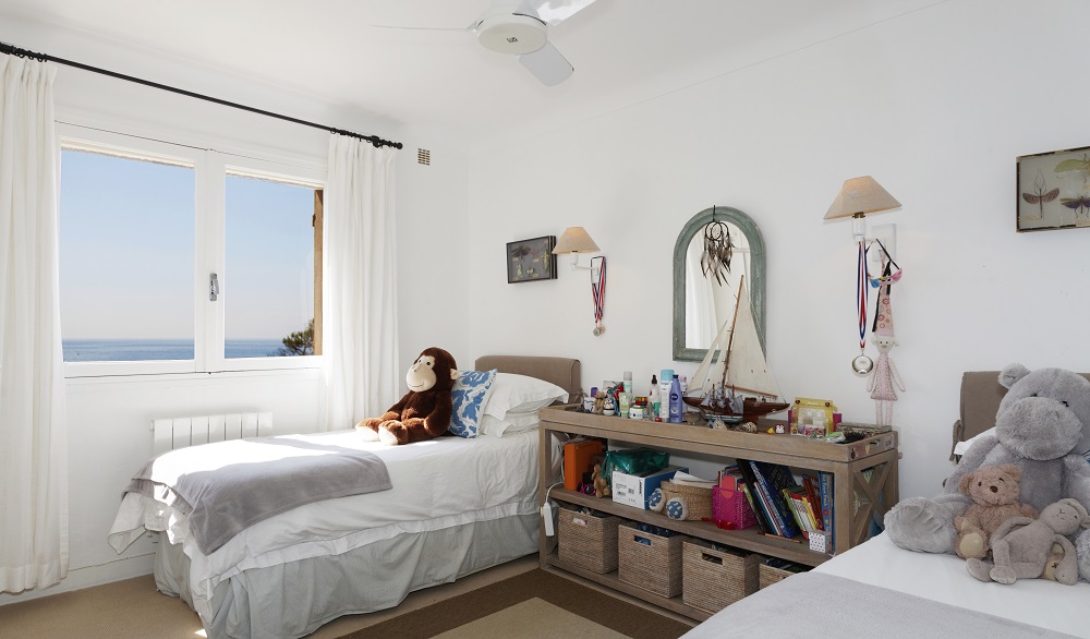 Twin bedroom with fans, sea view