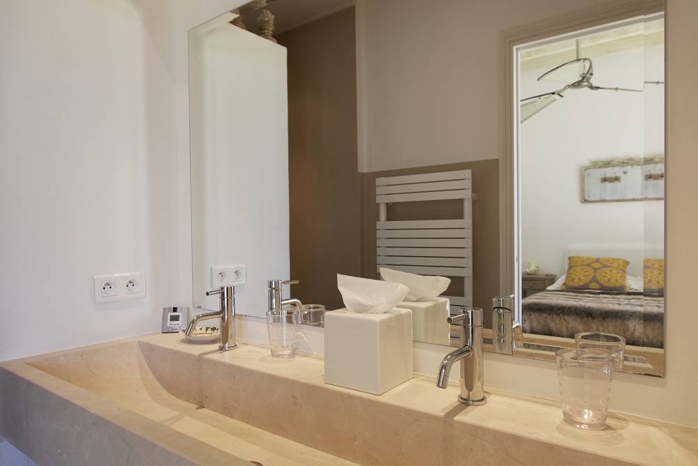 Double bedroom with queen-size bed, air conditioning, garden access and Ensuite bathroom with shower, wc, double sink