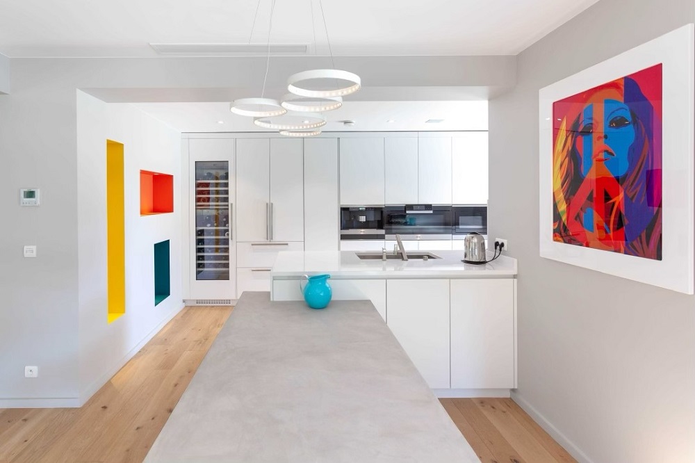 A spacious living room with large sofas, a dining room, and a fully equipped open kitchen (refrigerator/freezer, water and ice dispenser, induction hob, dishwasher, etc.). A separate laundry room is also available with a washing machine and dryer.
