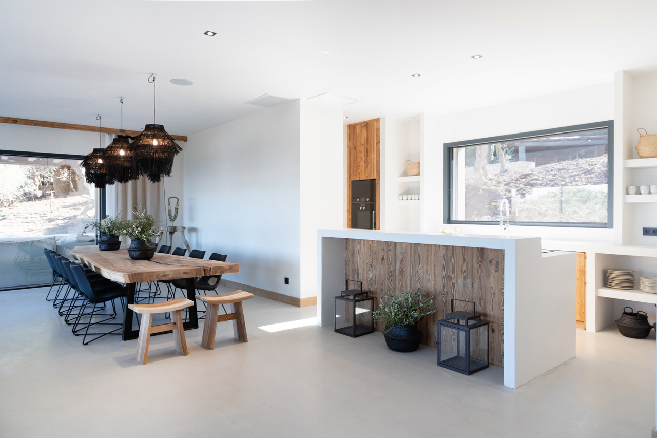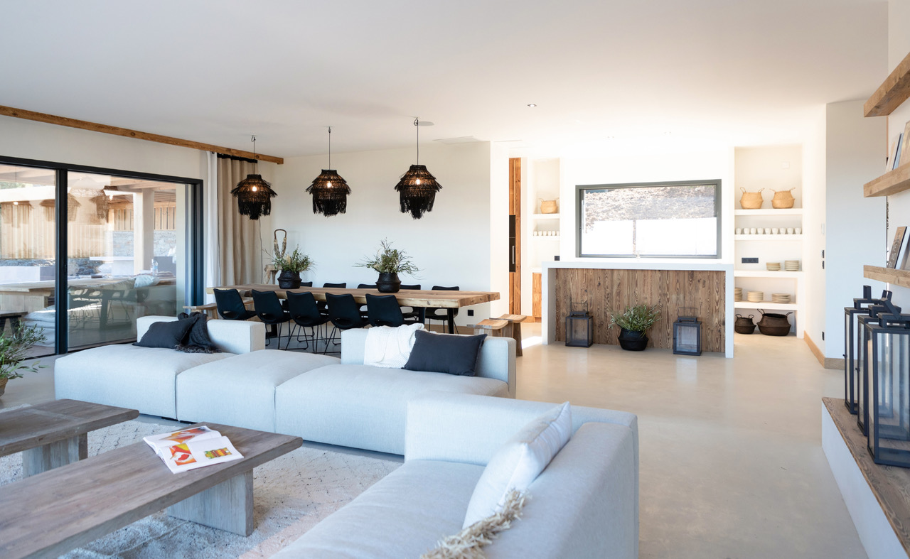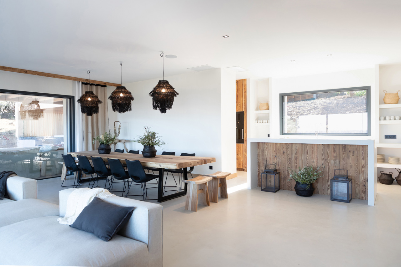 Living Room open-plan of 110 m2 with sea view, mountains view and Dining Room with large dining table that seats up to 14 people with terrace access