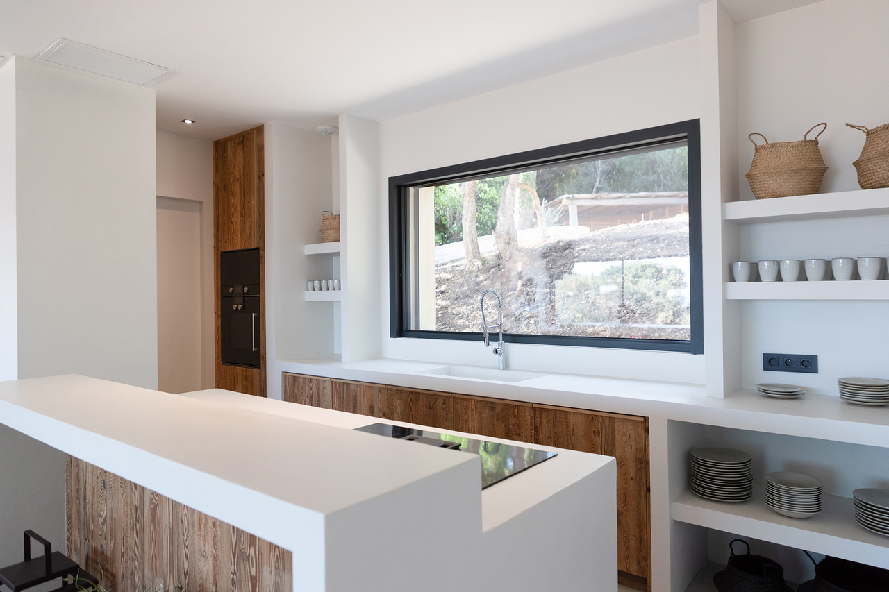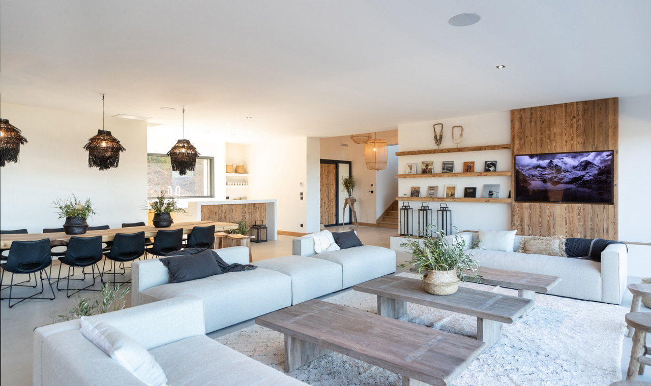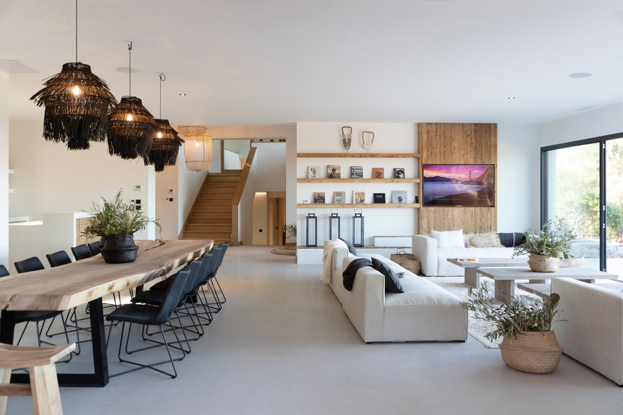 Living Room open-plan of 110 m2 with sea view, mountains view and Dining Room with large dining table that seats up to 14 people with terrace access